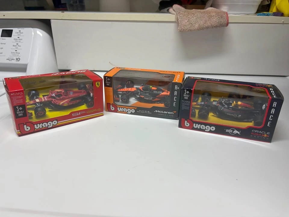97NIB SET OF 3 Bburago 1:43 scale die-cast models: Ferrari SF-24 Formula 1 car driven by Charles Leclerc, #16 during the 2024 F1 season. Oracle Red Bull Racing RB20, which was driven by either Max Verstappen (#1) or Sergio Pérez (#11) during the 2024 F1 season. Mclaren MCL38 from the 2024 Miami Grand Prix. This particular car model was driven by either Lando Norris (#4) or Oscar Piastri (#81). The die-cast car has a metal body with some plastic parts and rubber tires, and it features detailed sponsor decals and the "Papaya" livery from the Miami Grand Prix. It is intended for collectors and is recommended for ages 3 and up. Great Deal $20 for all 3 Unopened Location: PICK UP ONLY Riverbend area Street is Beeston Drive I’ll give house number when otw and eta given I get home after 6pm daily Or 1900 Main St 10am-5pm Tues, Thurs, Fri, Sat