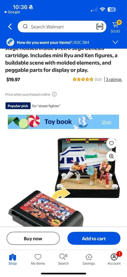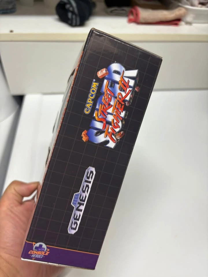 NIB Console Heroes: Street Fighter II brings the iconic dock stage to life in a detailed collectible diorama. This officially licensed set features a mini scene built into a plastic Sega Genesis game cartridge that folds open to reveal a sculpted stage inspired by Ken’s classic background. It includes two 1.5-inch mini-figures of Ryu and Ken, each with peggable bases for easy placement around the scene. The diorama features molded elements including a Hadouken energy blast on a clear stand, a barrel prop, four corner bits, and a printed backdrop of the dock and boat with health bars at the top of the scene. The cartridge closes shut when not on display, and the figures are designed for external display and do not store inside. Perfect for collectors, gamers, and fans of retro video game memorabilia. For ages 8 and up.