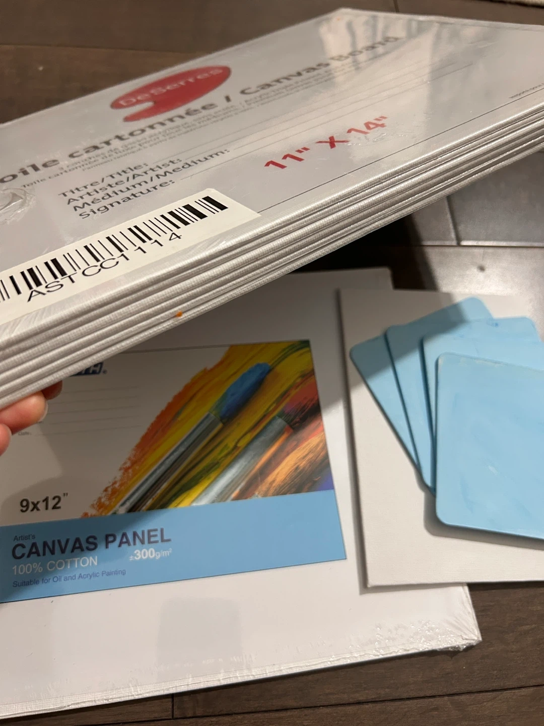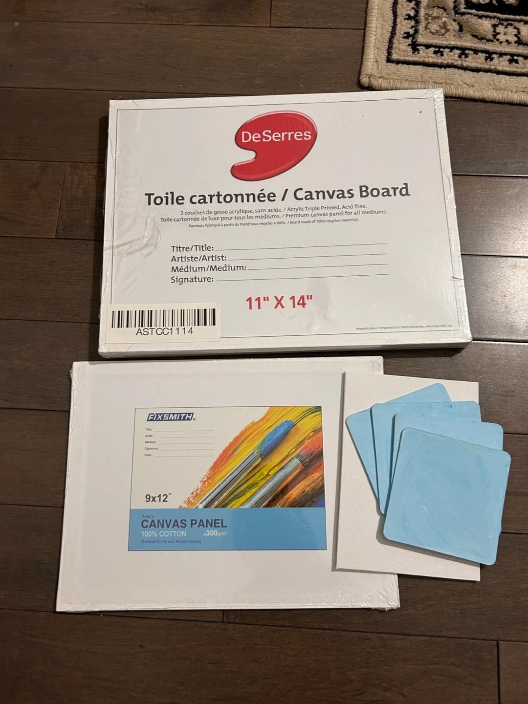 Selling a mix of canvas boards from De Serres and Fixsmith! You'll get a variety of sizes, including 11" x 14" from De Serres and 9" x 12" from Fixsmith. Perfect for all your painting needs. The Fixsmith canvas panels are 100% cotton with a weight of 300g/m², suitable for oil and acrylic painting