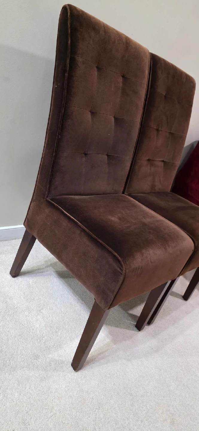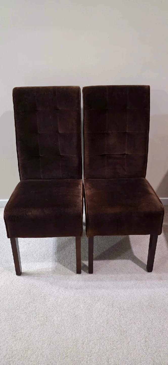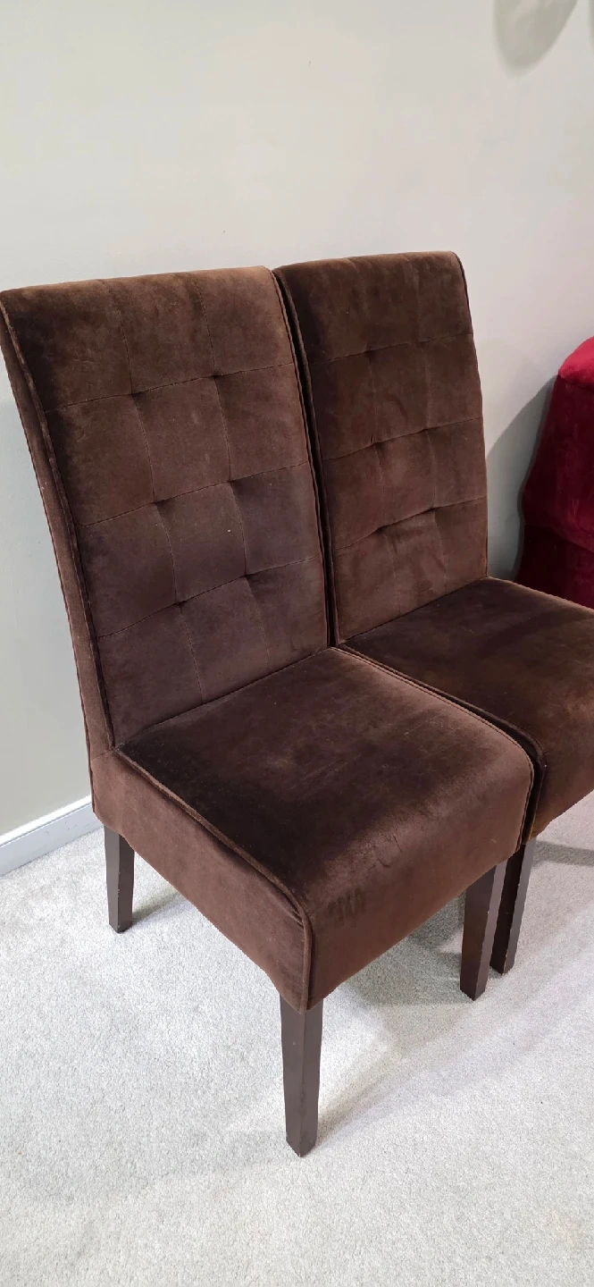 Selling a set of two lovely brown upholstered dining chairs. It's just the camera and valvet making it look that faded.