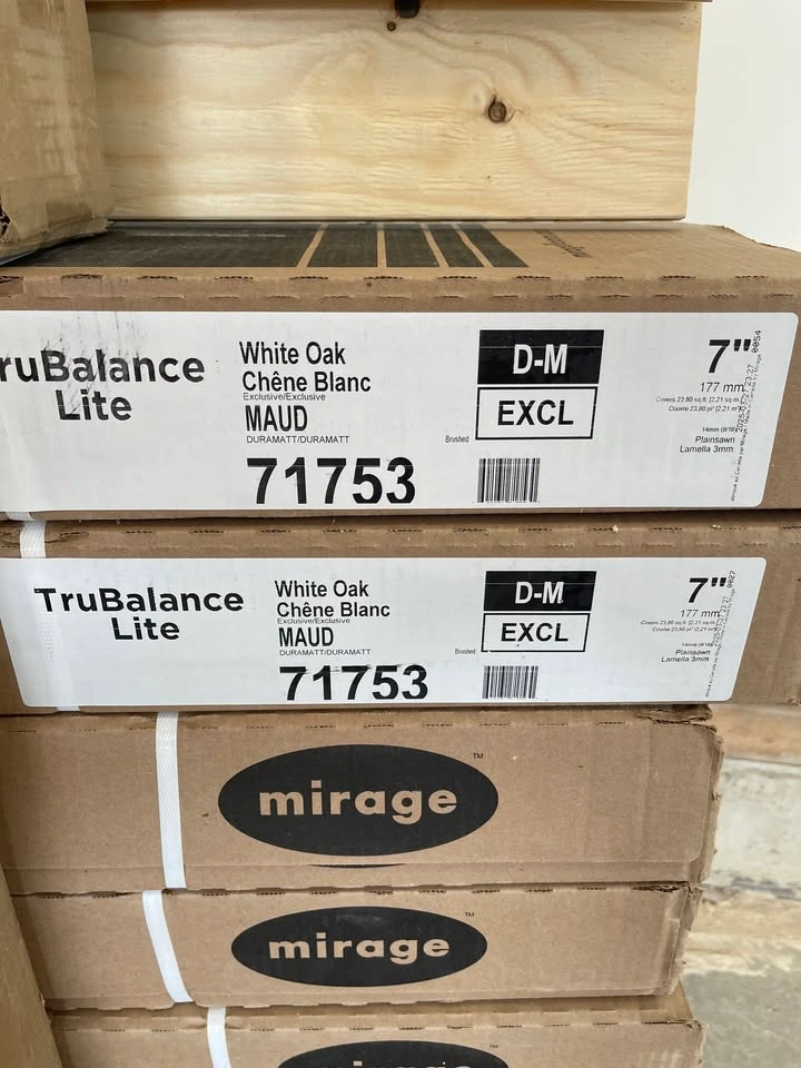 5 NEW boxes. Each box covers 23.8 square feet. Mirage Muse series color Maud White Oak Brushed Trubalance Lite. 9/16”x7” Exclusive grade (less knots), various lenghts in each box. Accessories not included, pick up only, cash only, no holds