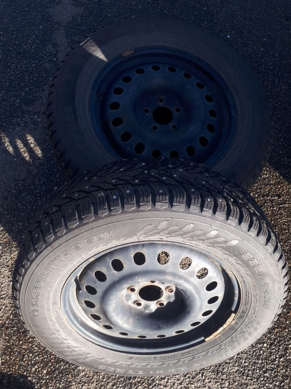 Selling a set of 4 Nokian Hakkapeliitta Studded winter tires. The size is 235/65R18. Those are coming studded from the factory. Those come on rims. Came off the Ford Explorer Trac.