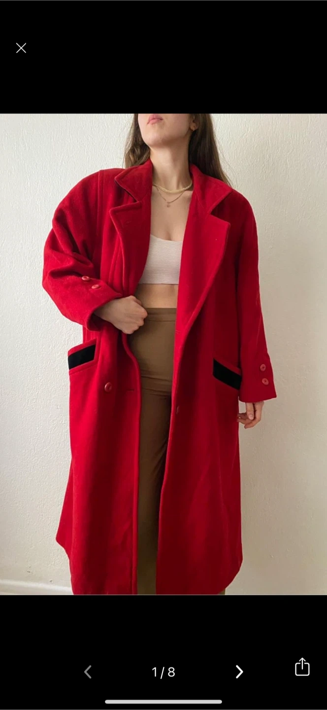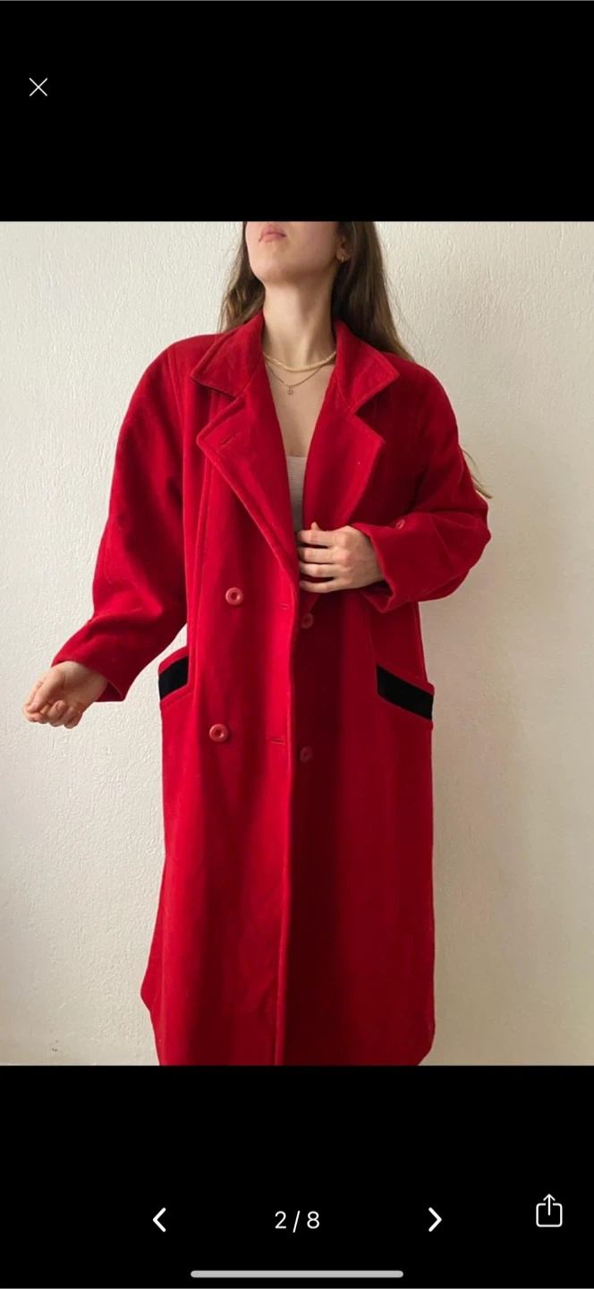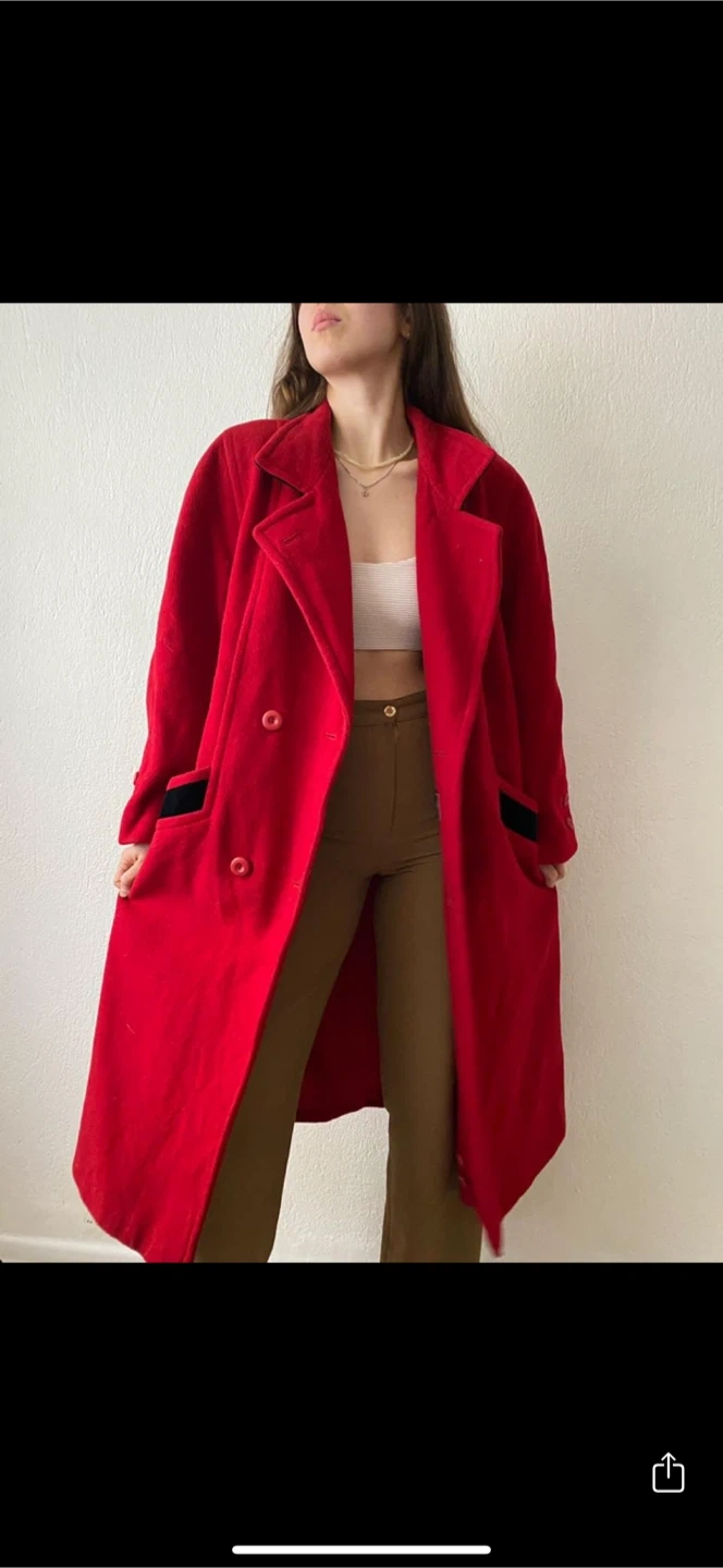 Here's a stylish red coat that's perfect for adding a pop of colour to your wardrobe! It features a double-breasted design and a cozy wool blend material. The coat also has black accents on the pockets for a touch of contrast. It's in great condition and ready for a new home!