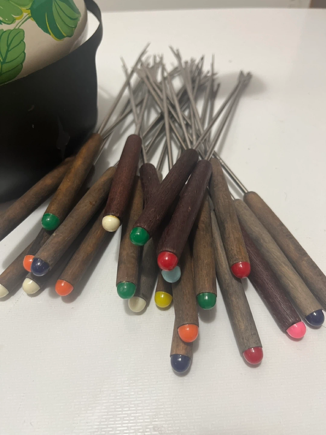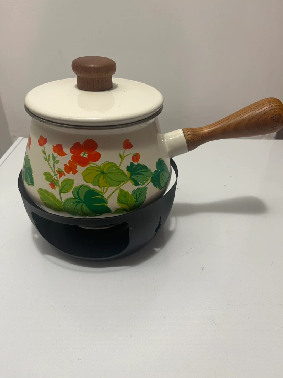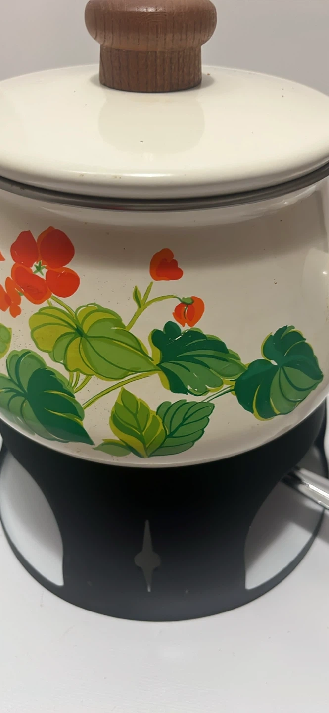 Selling a charming vintage fondue set! It includes an enamel pot with a floral design, a burner stand, and fondue forks with colourful tips. Perfect for cozy nights and entertaining friends!