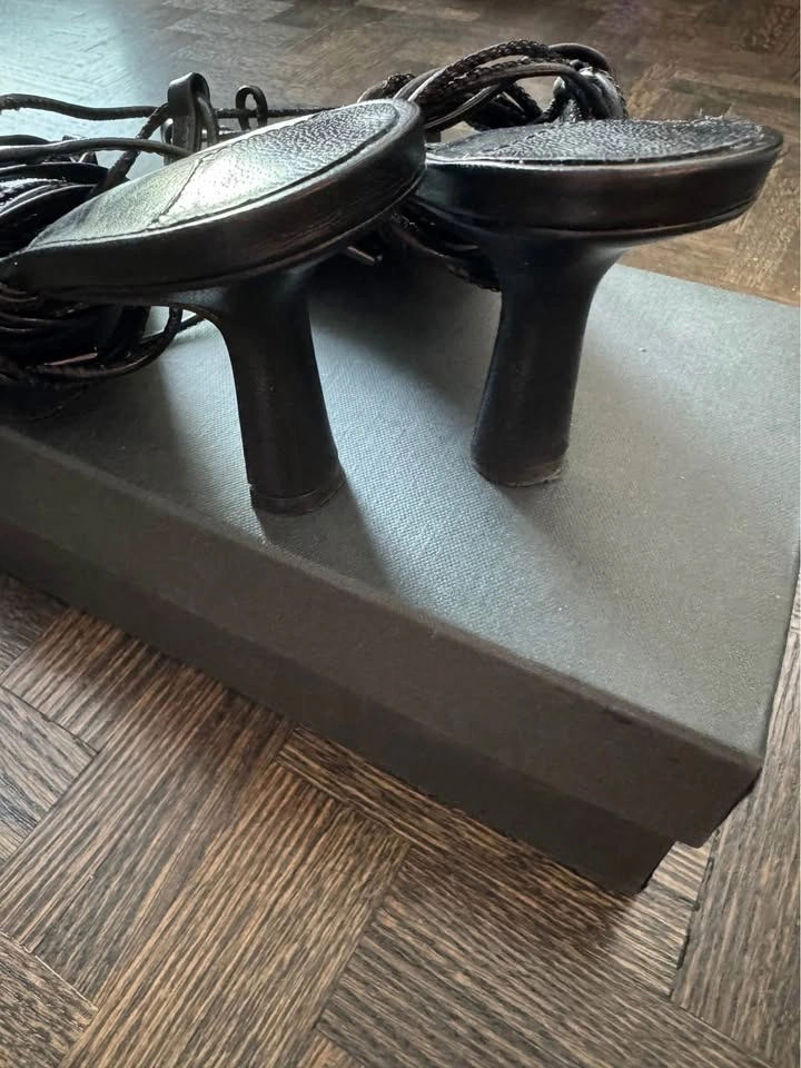 Leather upper with man made sole. Wrap ankle with tie closure. Square toe. Heel measures approx 3" / 8 cm H. Made in China. Great condition.