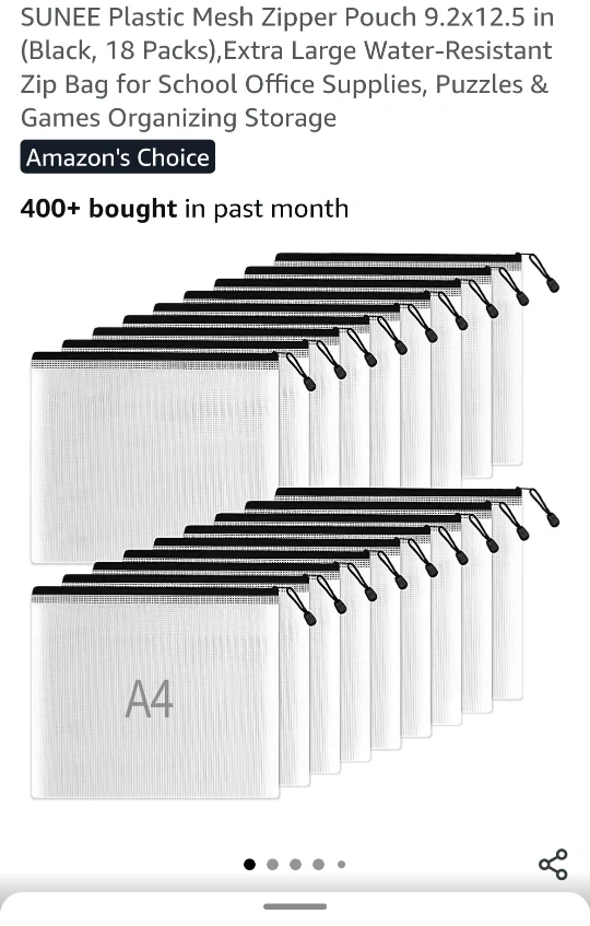 85I'm selling a brand new pack of SUNEE plastic mesh zipper pouches! These are extra large, measuring 9.2 x 12.5 inches, and are water-resistant. Great for organizing school or office supplies, puzzles, and games. There are 18 pouches in the pack. Location: Taunton and Townline Check out my other listings