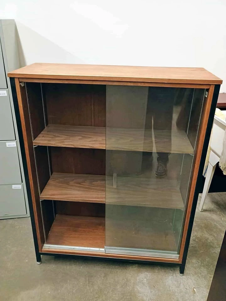 Wood Bookcase With Sliding Glass Doors and Adjustable Shelves. In good condition. Measures approximately 36" wide x 14" deep x 46" tall. $80 plus HST.