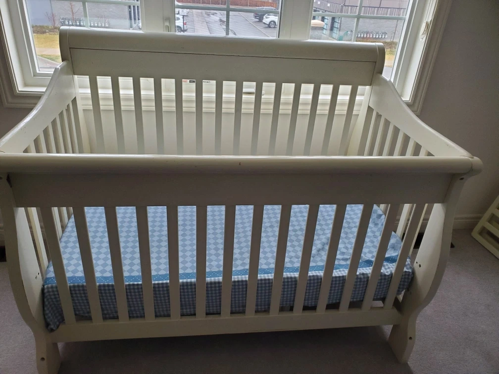 Selling a barely used baby crib with mattress. It's in great condition and ready for a new home. It's a standard size crib and comes with a new mattress. My baby hardly used that.