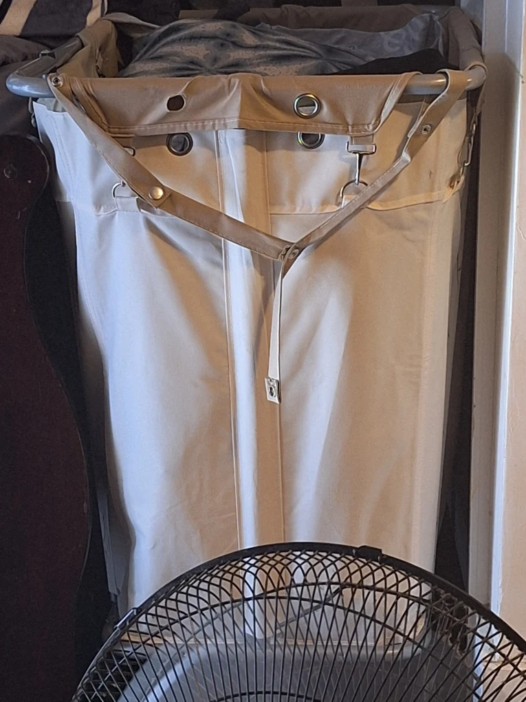 Selling a PLKOW laundry cart with wheels in beige. It's a large rolling laundry cart perfect for commercial or home use. The basket is made with a steel frame and waterproof Oxford cloth. Dimensions are 32.3L x 19.7W x 30.7H inches, and it holds 9 bushels (320L). Originally bought for $111.99