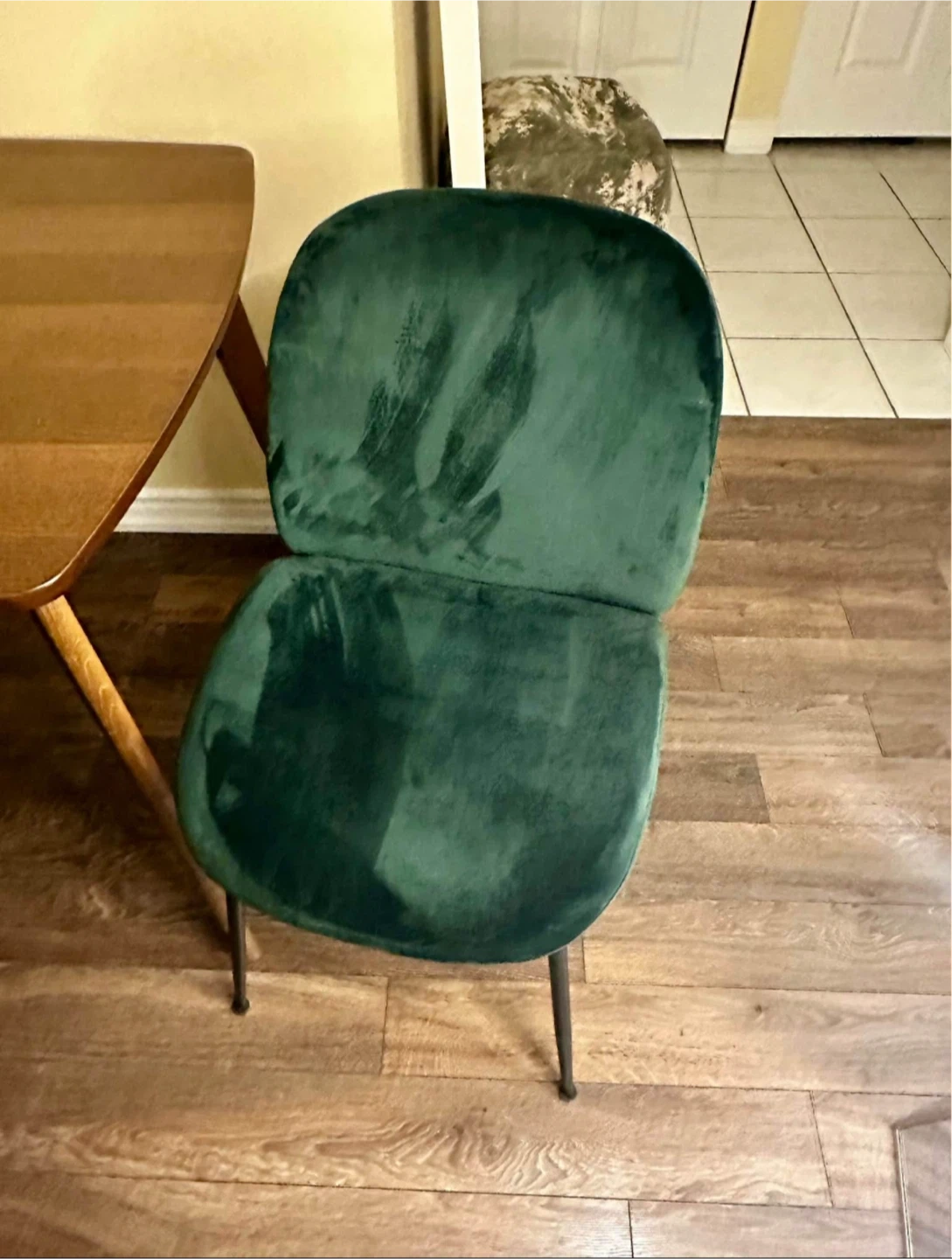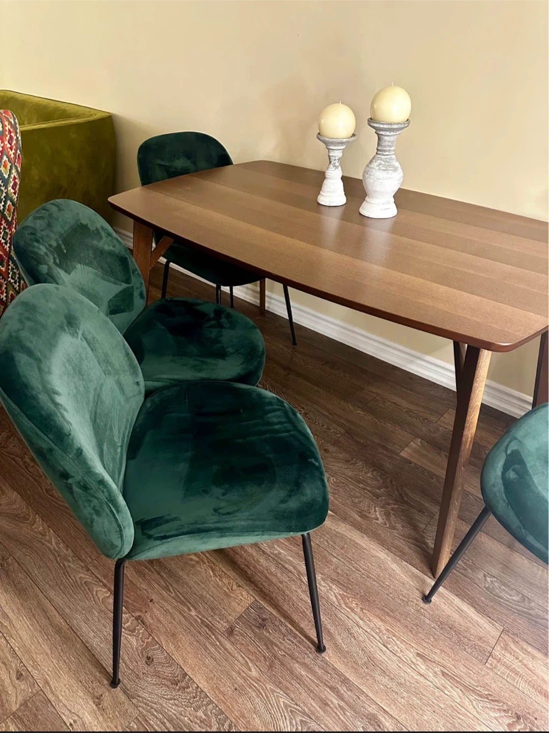 Selling a set of four beautiful green velvet dining chairs and structube table. They're in great shape and would add a touch of elegance to any dining room or kitchen! It’s used but in excellent condition.I’m open to offers and depending on location can deliver