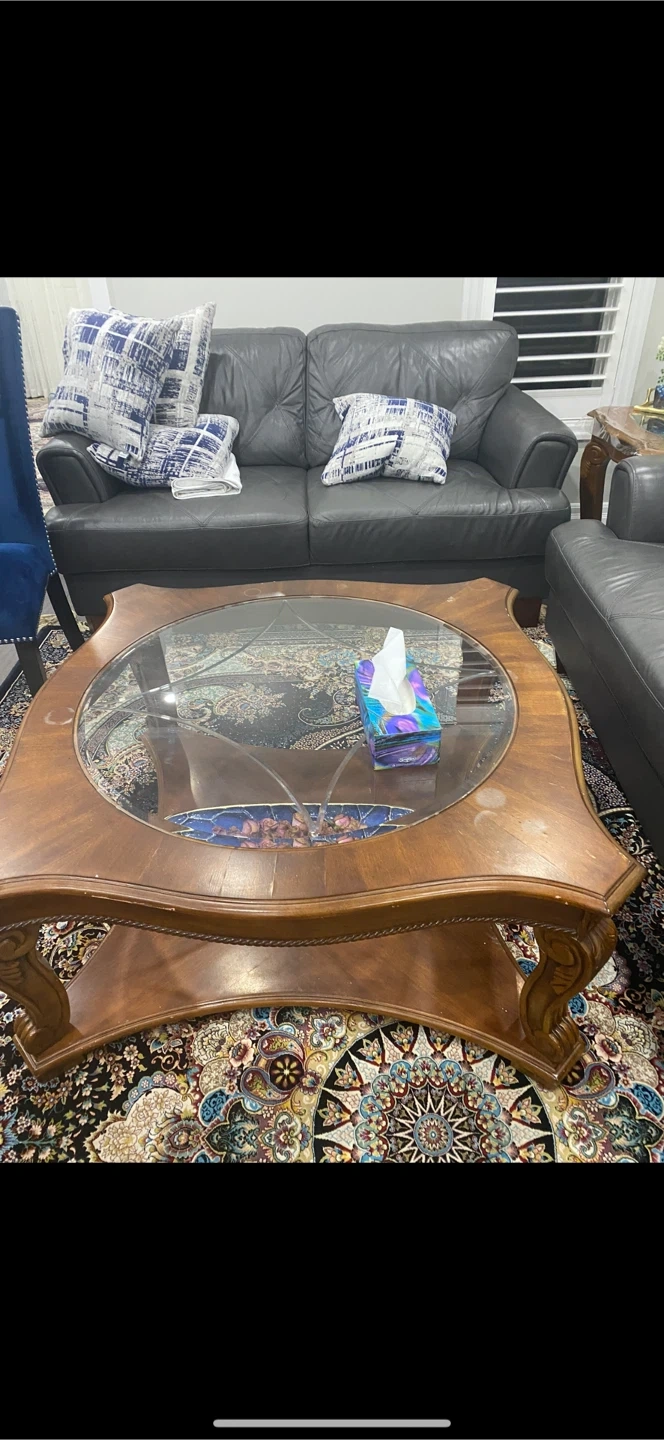 Selling a wooden coffee table that features a glass top. It's a stylish piece that would look great in any living room setting. The table has a sturdy wooden frame and a clear glass surface, perfect for displaying decorative items or serving snacks and drinks 1 big one and 1side