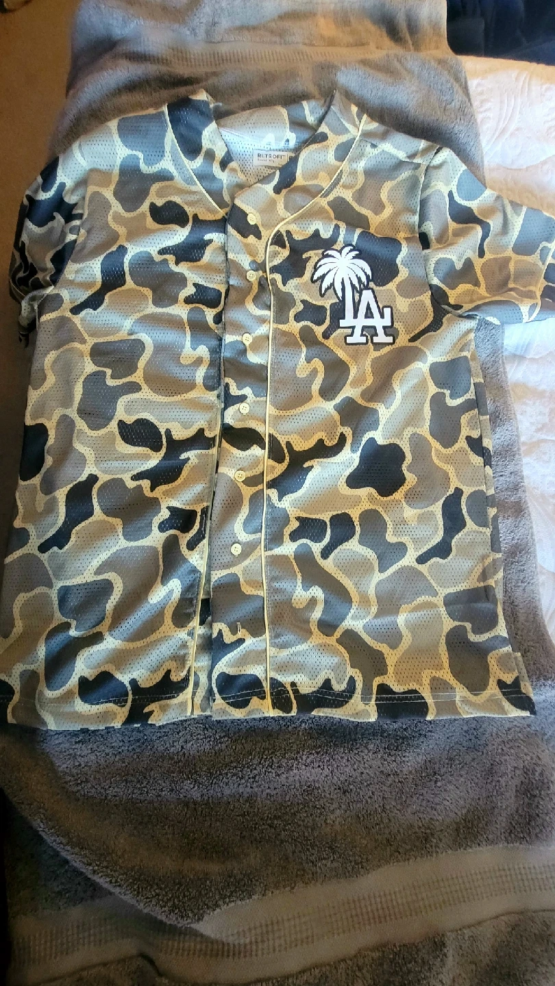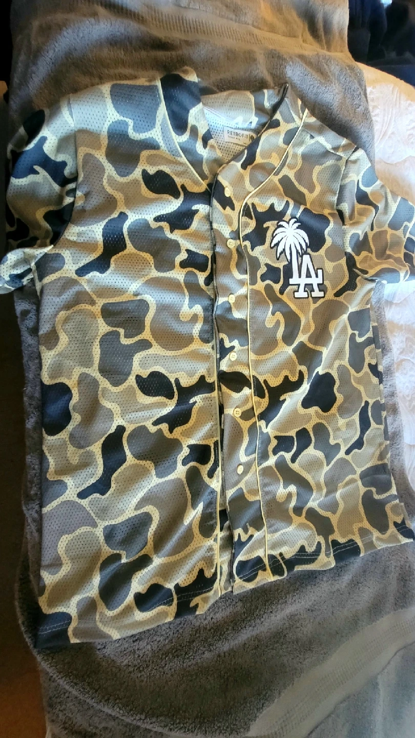 Selling a Retrofit brand Los Angeles Dodgers baseball jersey in a cool camo pattern. It's a size XL and features the Dodgers logo. Great for any Dodgers fan!