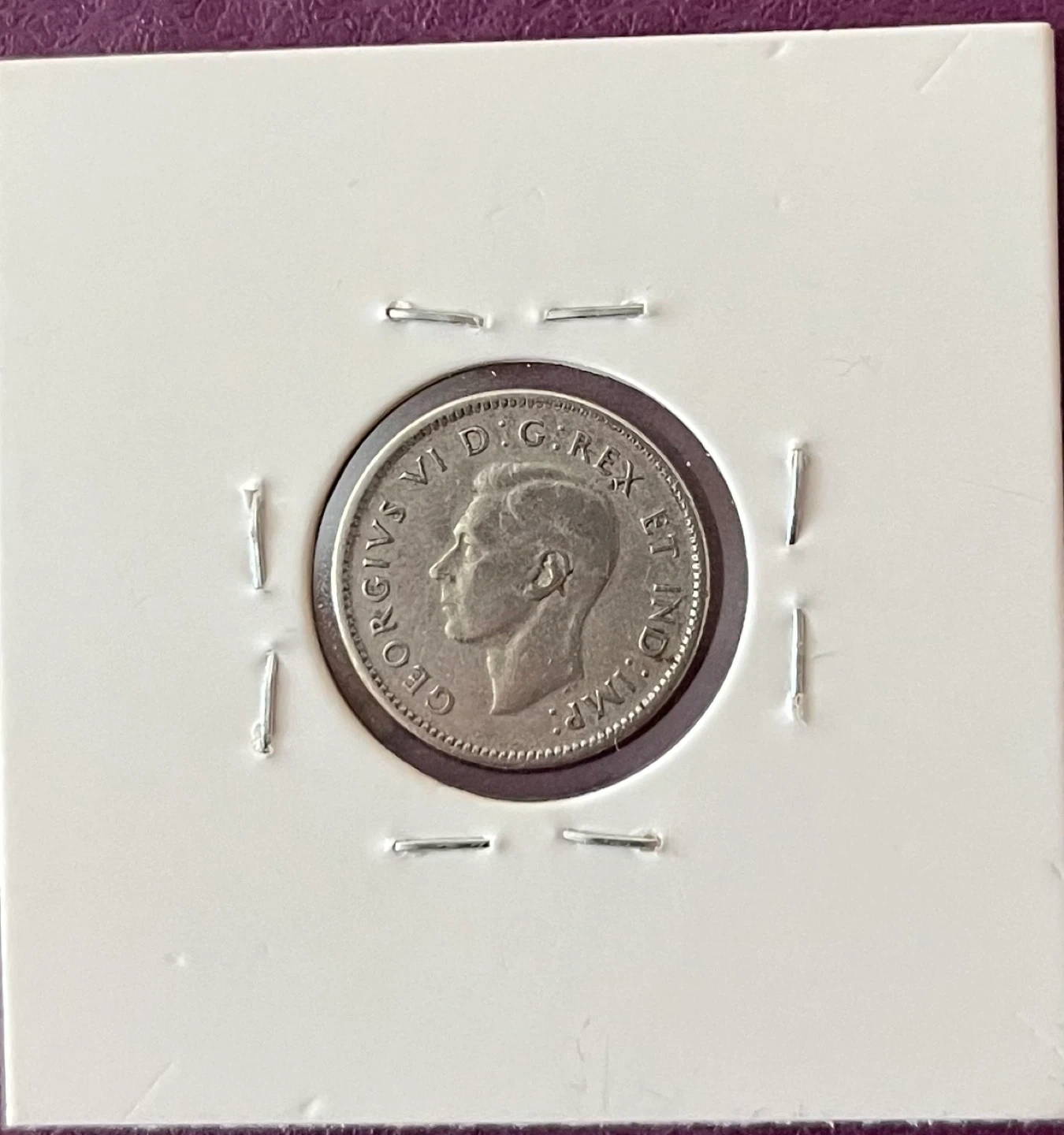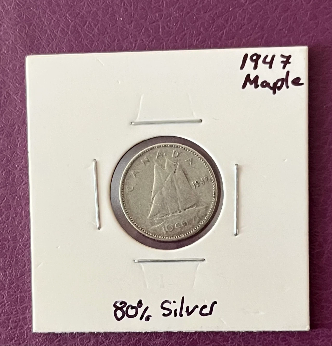 286Available only for six days Selling a vintage Canadian 10 cent coin from 1947. It appears to be made of 80% silver and features a maple leaf design. Great for collectors!