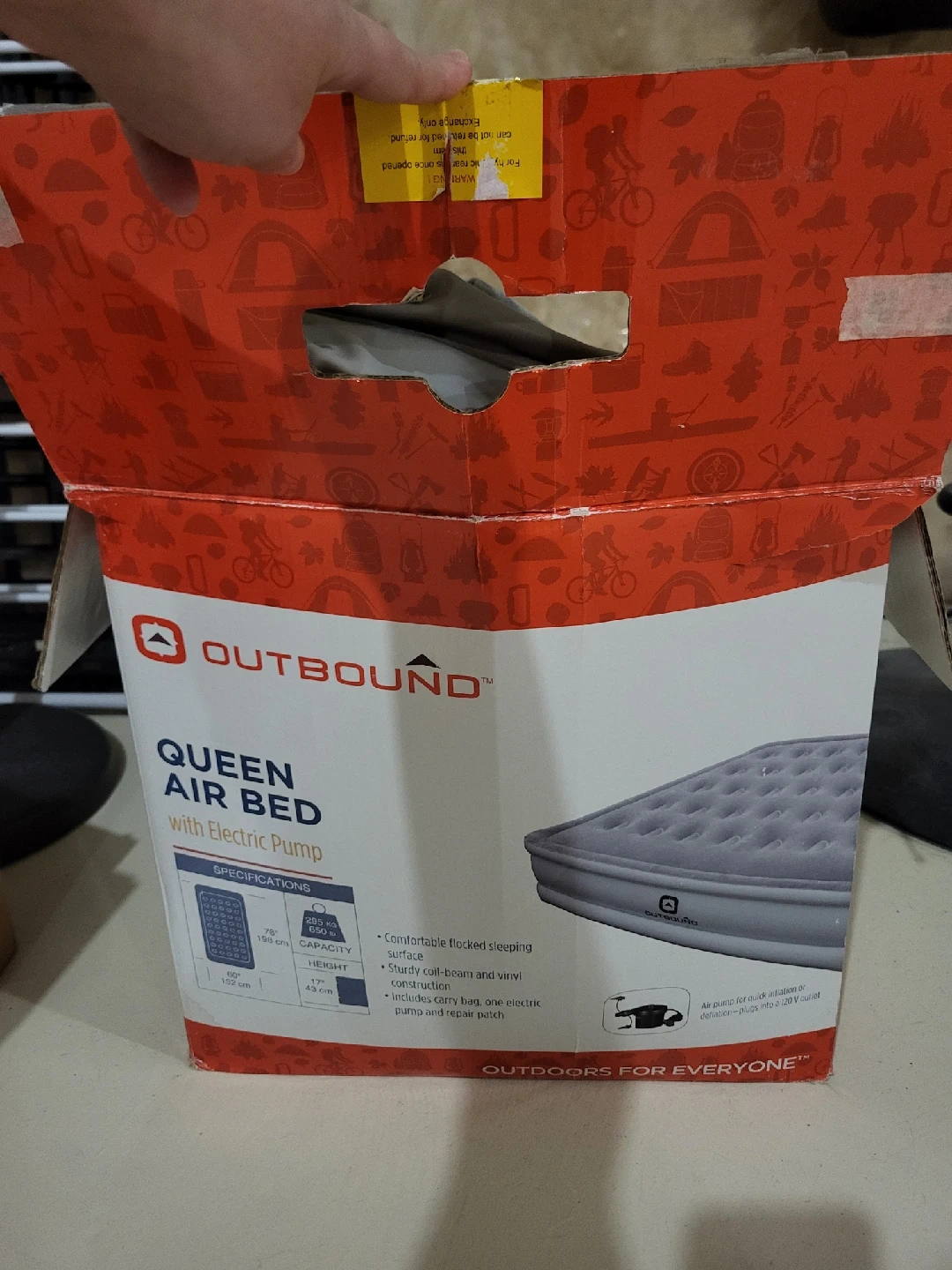 Selling an Outbound queen air bed with an electric pump! It's a comfortable flocked sleeping surface with a sturdy coil-beam and I-beam construction. Includes a carry bag, one electric pump, and a repair patch. Dimensions are 198 cm length, 152 cm width, and 43 cm height.