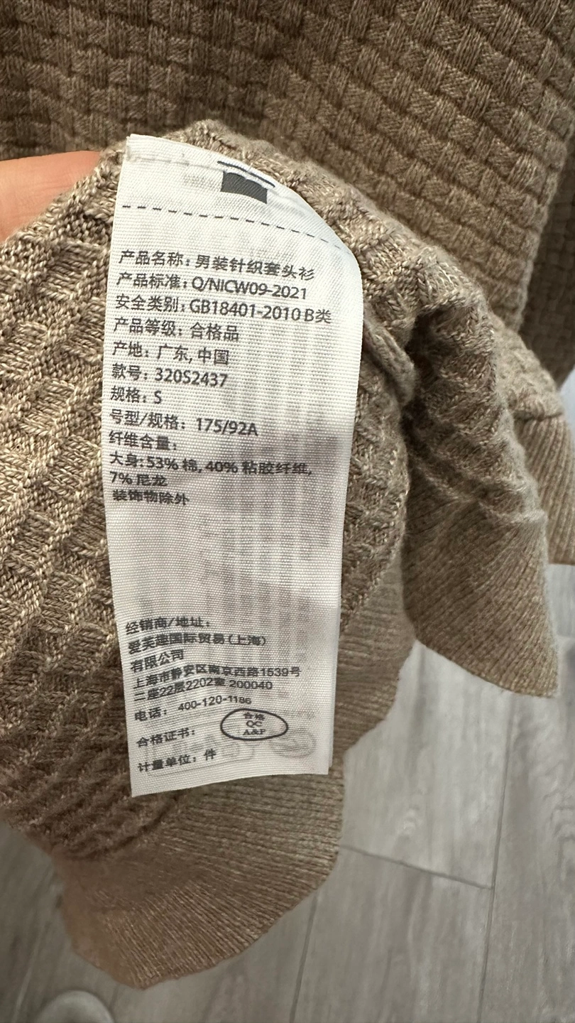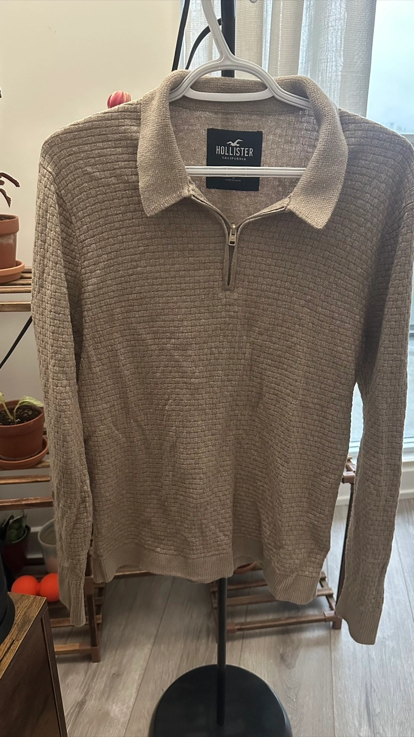 Selling a Hollister men's knit polo sweater in size small. It's a stylish and comfortable piece, perfect for layering or wearing on its own. The material is a blend of 53% cotton, 40% viscose fibre, and 7% other fibres.