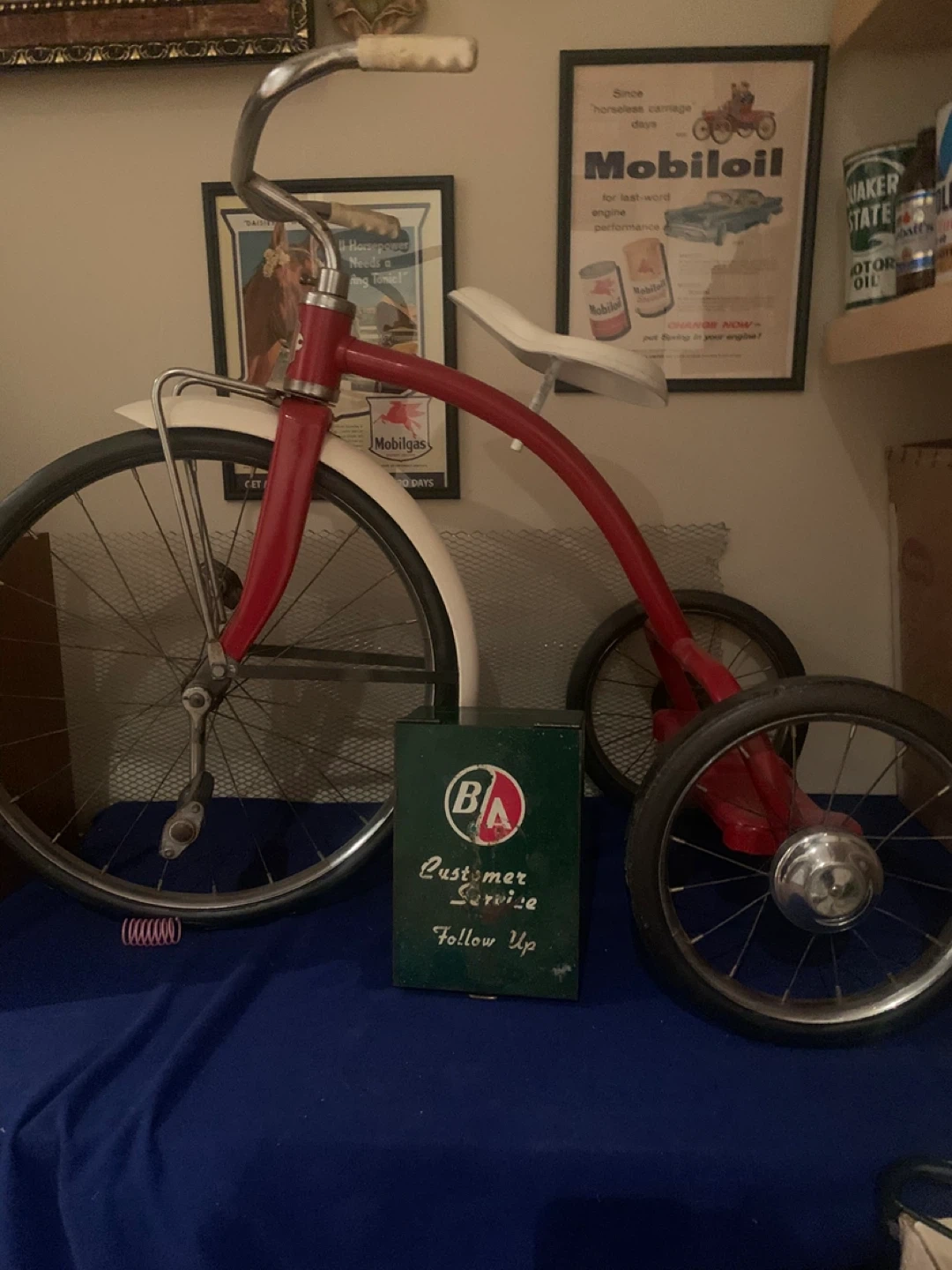 Selling a vintage red tricycle. It has a white seat and white front fender. The tricycle appears to be in good condition for its age. Vintage 1960s CCM with 20 inch big wheel . Overall height 31 inches. Comes with vintage working bell . It has been repainted . Great for kid’s photos or collection piece.