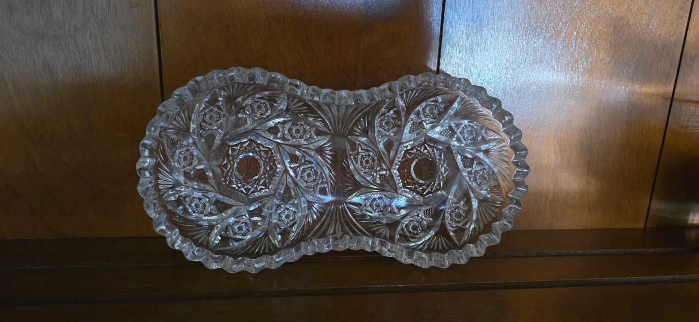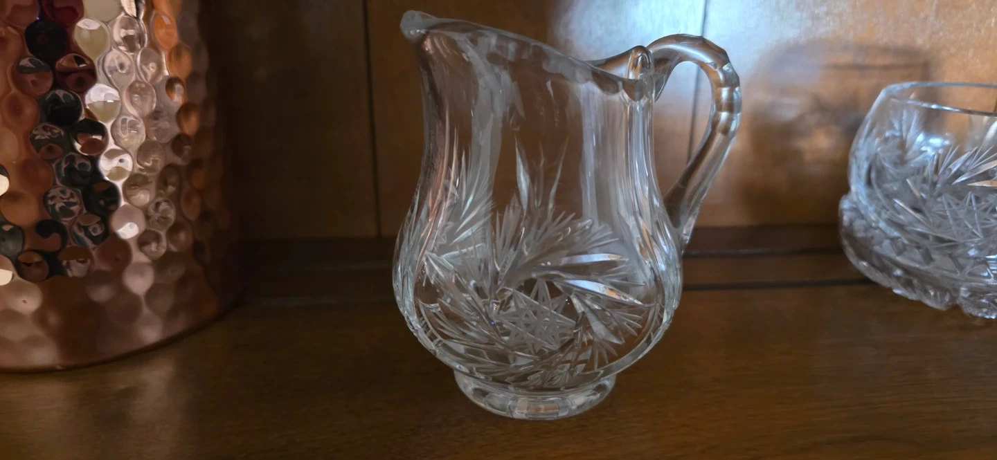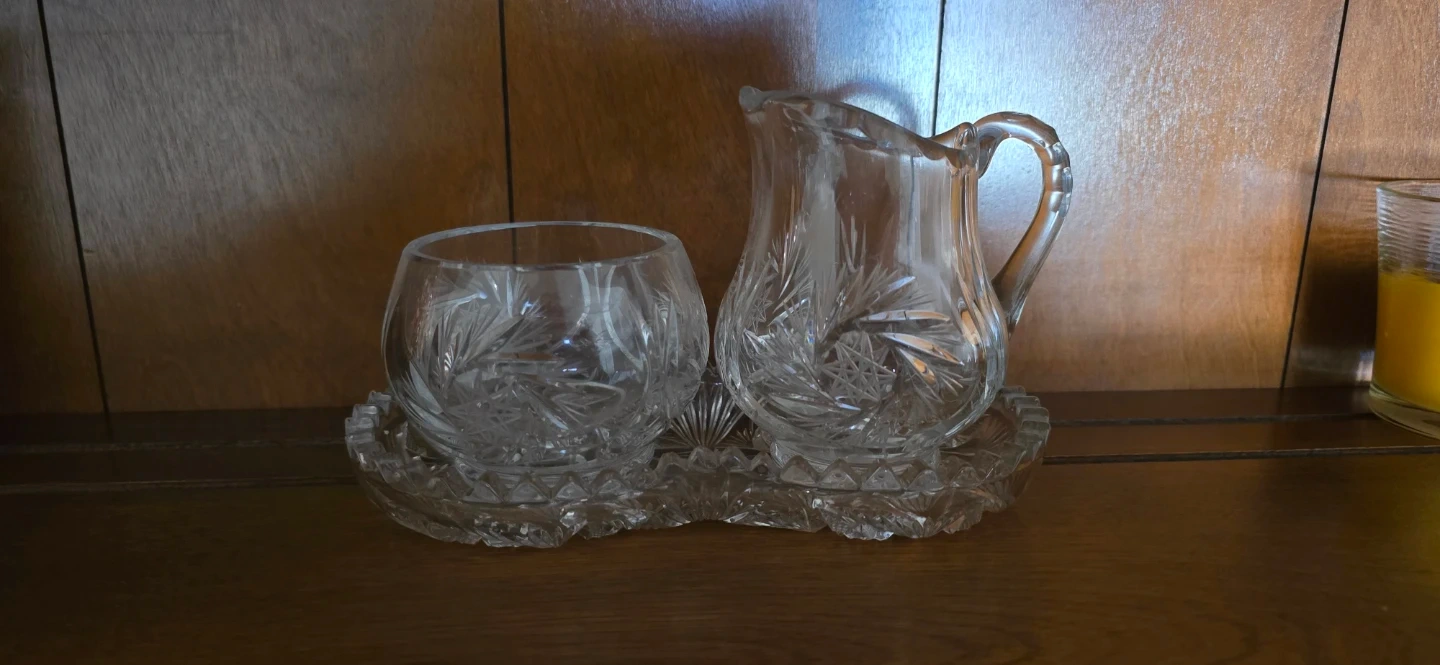 Selling a beautiful vintage cut crystal set! It includes a creamer, a sugar bowl, and a matching tray. The intricate starburst pattern is very eye-catching and would be a lovely addition to any table setting