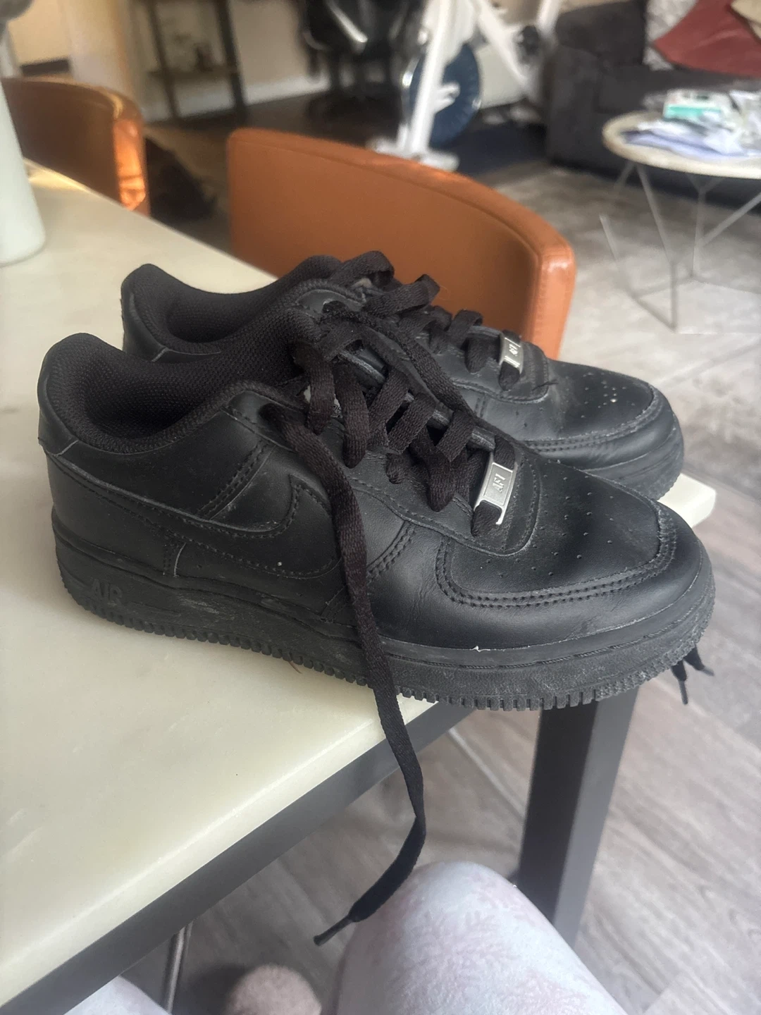 Selling a pair of Nike Air Force 1 shoes in black. They show some signs of wear but are still in good condition for everyday use. Great for casual wear!