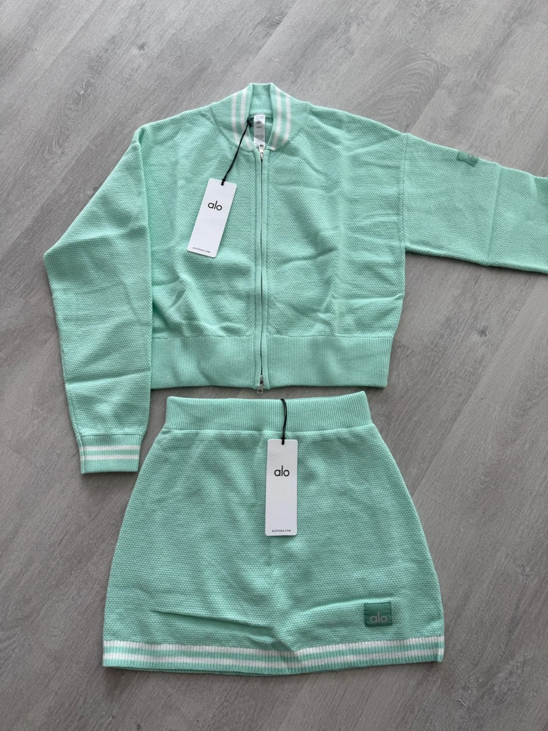 This is a brand new Alo Yoga Tennis Club Sweater Knit skirt set. The set includes a full zip jacket and a skirt, both in size S. The original price for the jacket was CA$248 and the skirt was CA$128