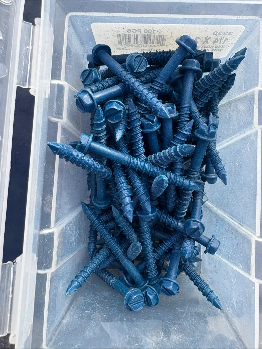 Selling a container of Buildex Tapcon screws, size 1/4" x 2-1/4". Perfect for concrete, block, and brick applications. Includes 100 screws and a Tapcon drill bit.