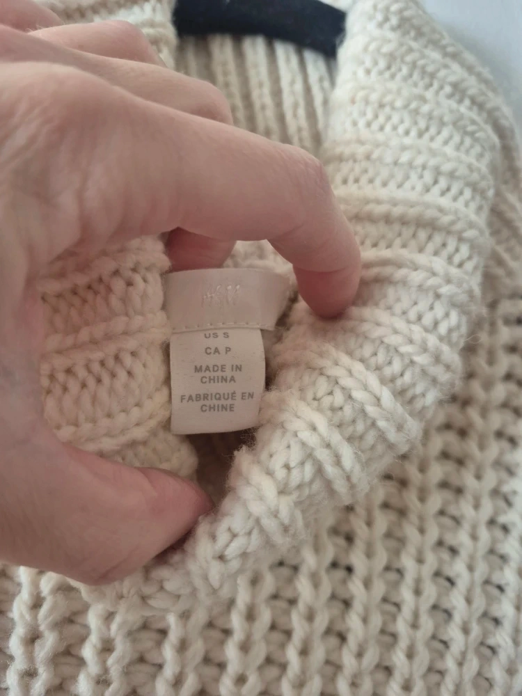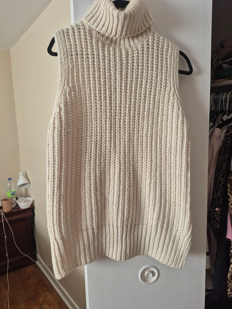 875Selling a cozy cream-coloured knit sleeveless turtleneck from H&M! It's a size small and perfect for layering during the cooler months. The material is soft and comfortable, making it a great addition to any wardrobe