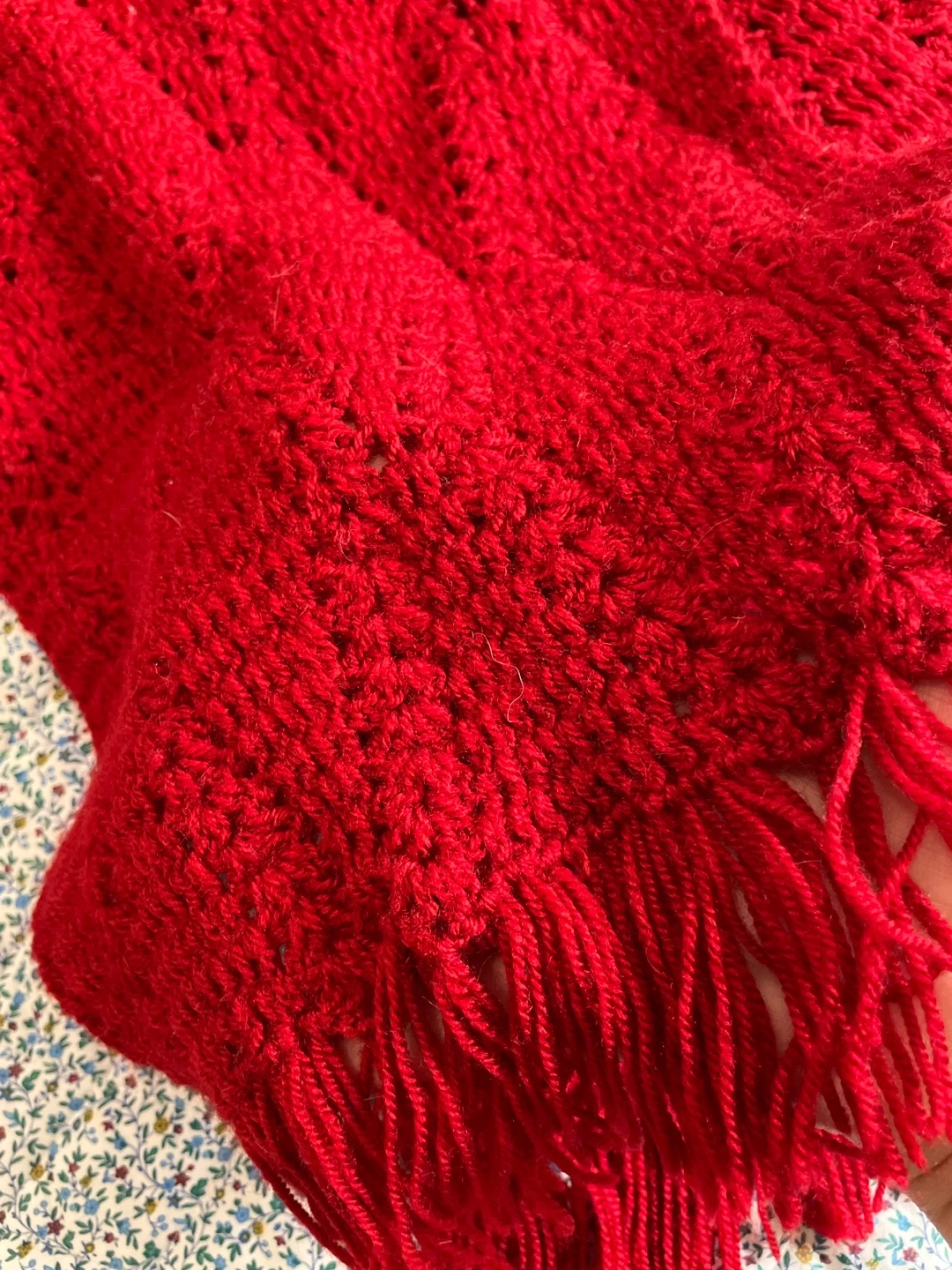 I'm selling a beautiful, handmade red crochet scarf. It's in great condition and measures approximately 38 inches in length. Perfect for adding a pop of colour to your outfit!
