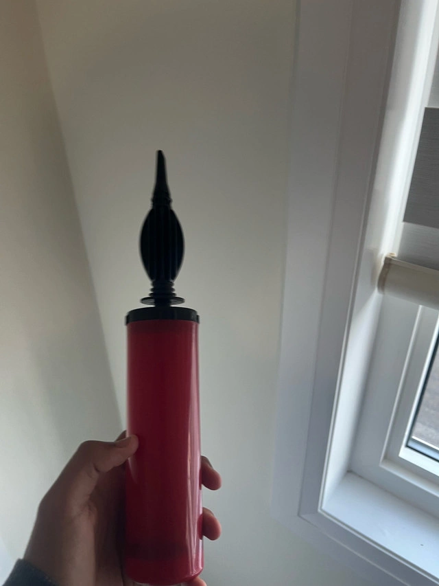 This red hand pump is in good condition and ready to inflate your inflatables quickly and efficiently. It's a simple, reliable tool for inflating balloons, air mattresses, and more. This item is used. Additional specs: * Compact and lightweight design * Durable plastic construction * Easy to use If the ad is up, the pump is available. It's just waiting for a new home to call its own!
