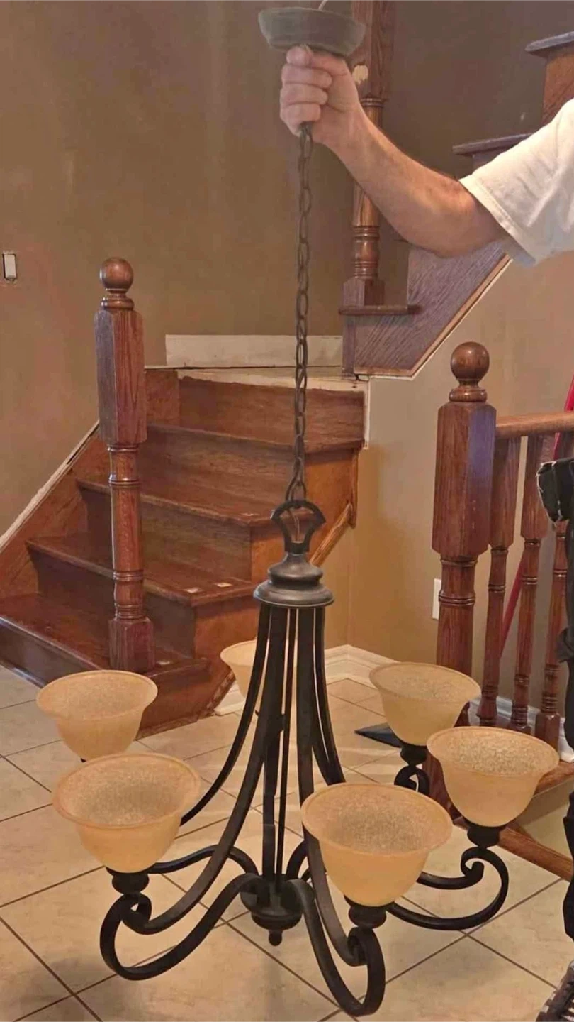 57Selling a chandelier with 5 lights. It features a dark metal frame and frosted glass shades. It would make a great addition to any dining room or entryway