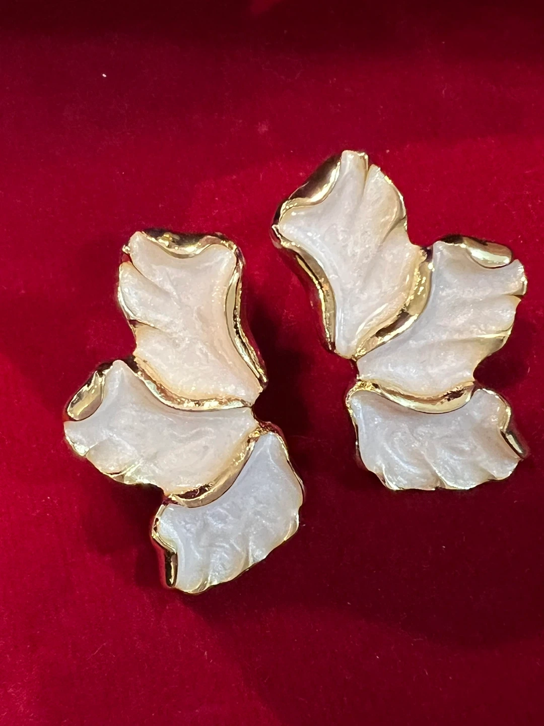 167These earrings feature a unique flower design with a white and gold colour scheme. They're in great condition and would be a lovely addition to any outfit