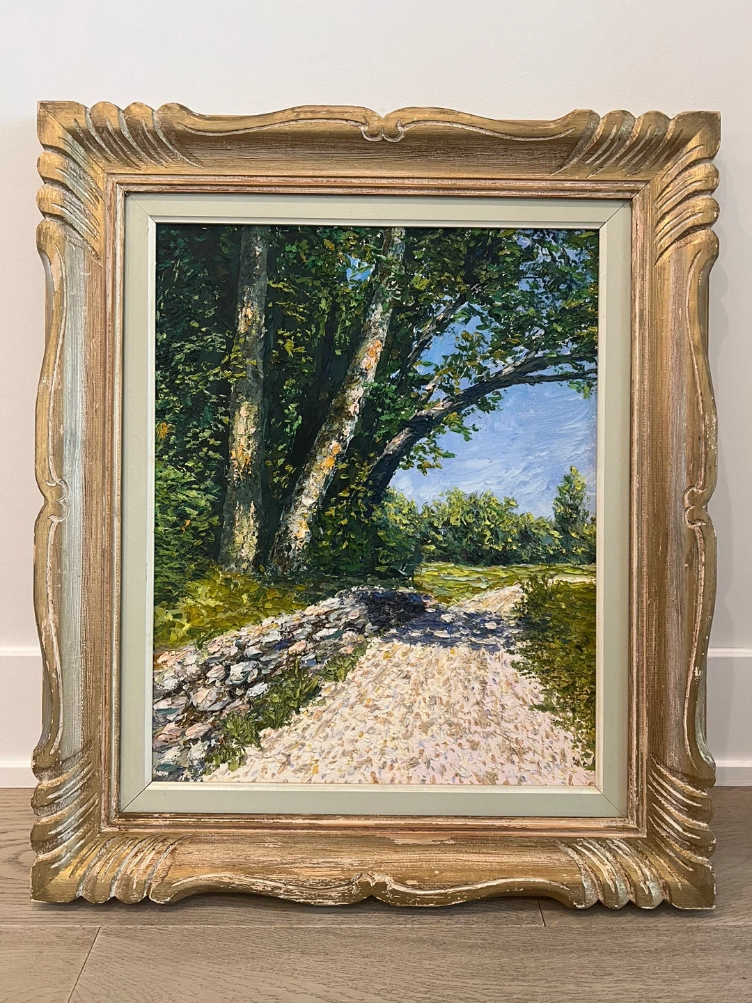 Beautiful vintage oil painting on canvas showing a sunny country path with trees and a stone wall.
