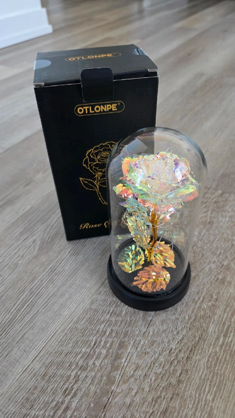 Beautiful OTLONPE Rose of Love in a glass dome. It's powered by 3 AAA batteries (not included). Comes with the original box!