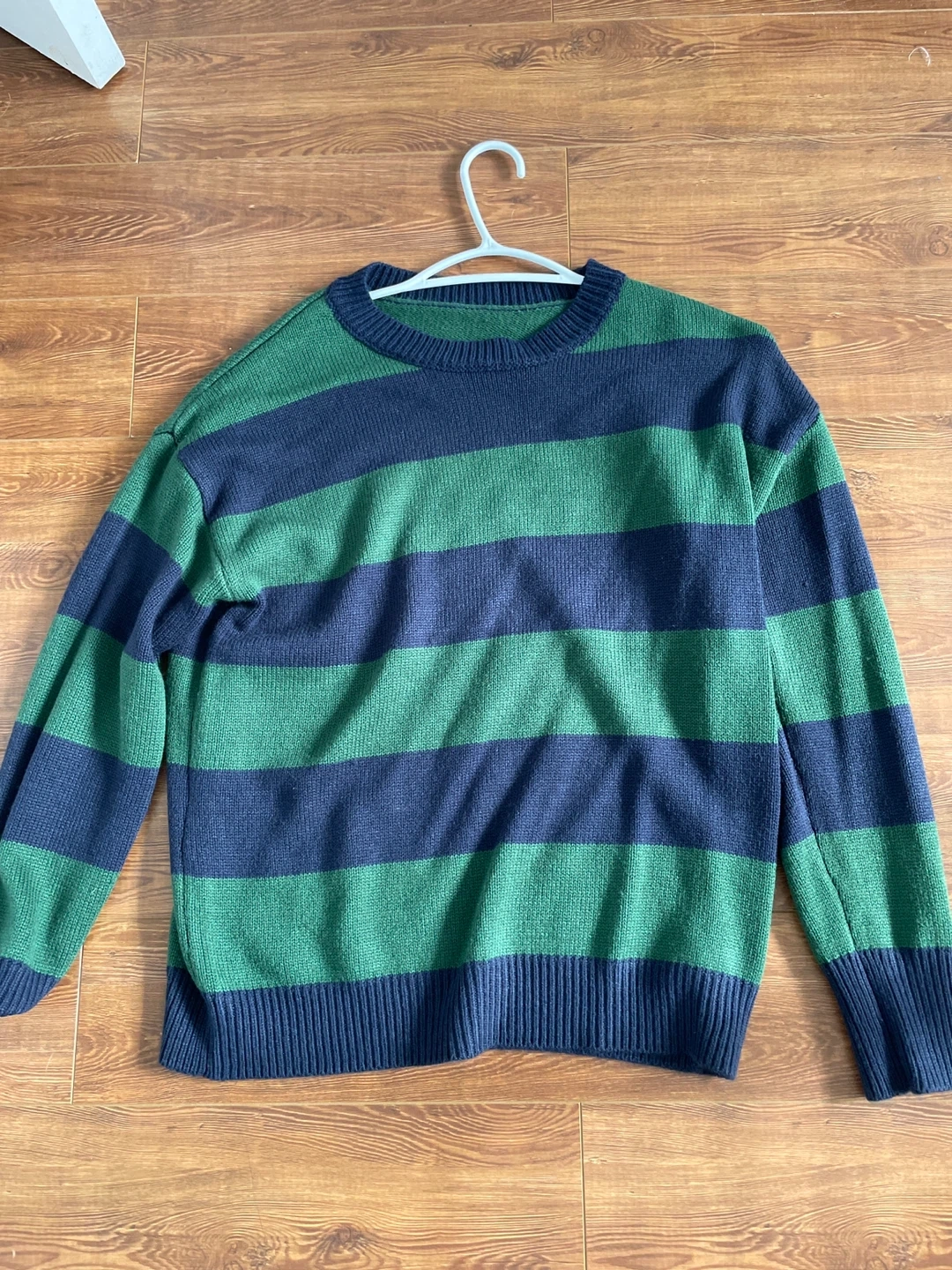 Cozy striped knit sweater in a classic green and navy colour combination! Perfect for those cooler days and nights. It's in great condition and ready for a new home!