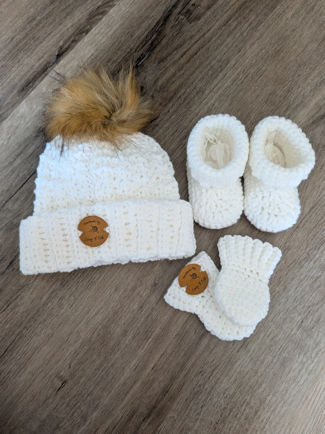 Super cute handmade crochet set for a baby! Includes a hat with a pompom, little booties, and mittens. All in a soft, cozy white yarn. Perfect for keeping your little one warm and stylish!