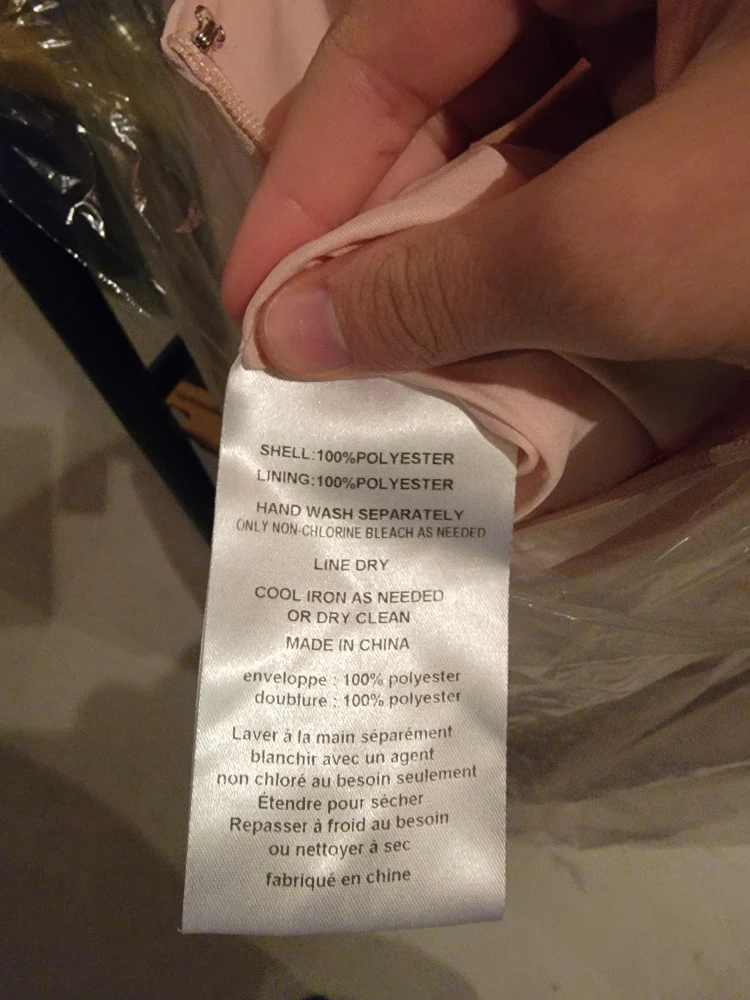 Selling a lovely Vera Wang dress! It's made of 100% polyester for both the shell and lining. For care, it's recommended to hand wash separately, use only non-chlorine bleach if needed, and line dry. You can also cool iron or dry clean as needed. Made in China