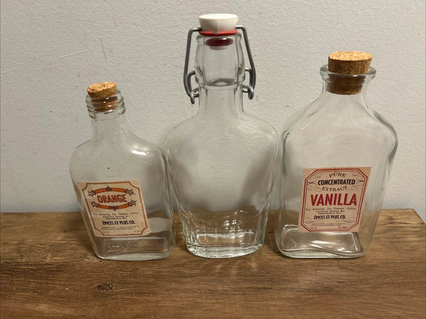 Épices Et Plus Co. pure orange extract bottle. It's for flavouring ice creams, jellies, candies, sauces, and cakes. Glass bottle with a cork stopper.