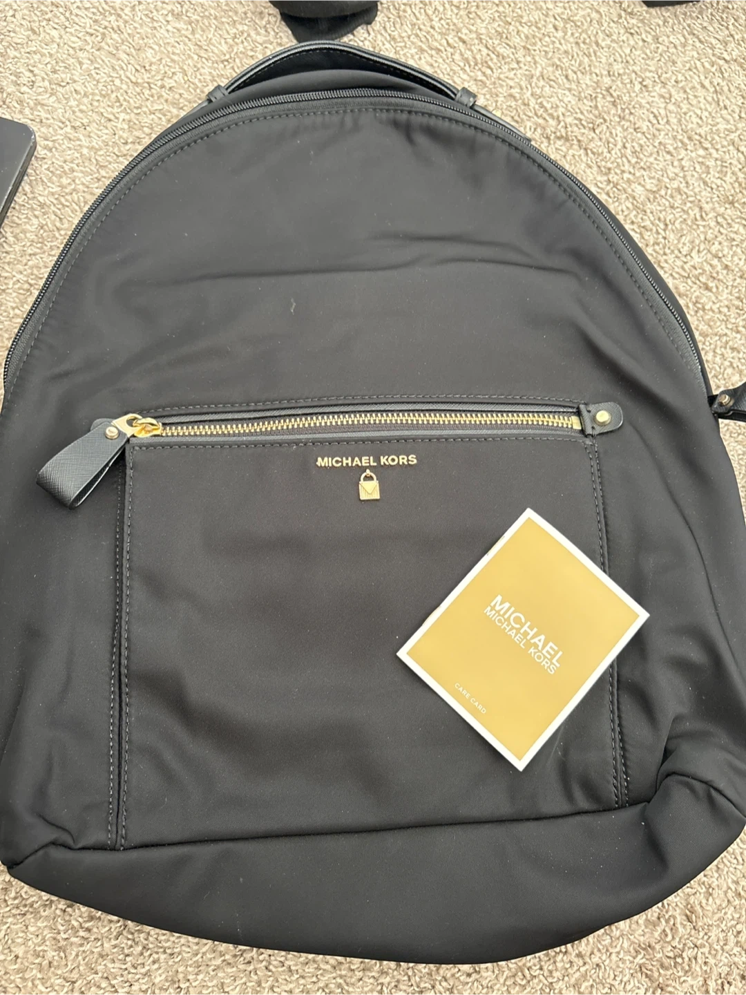 This is a black Michael Kors backpack. It's made of nylon with gold-tone hardware. Includes a care card.