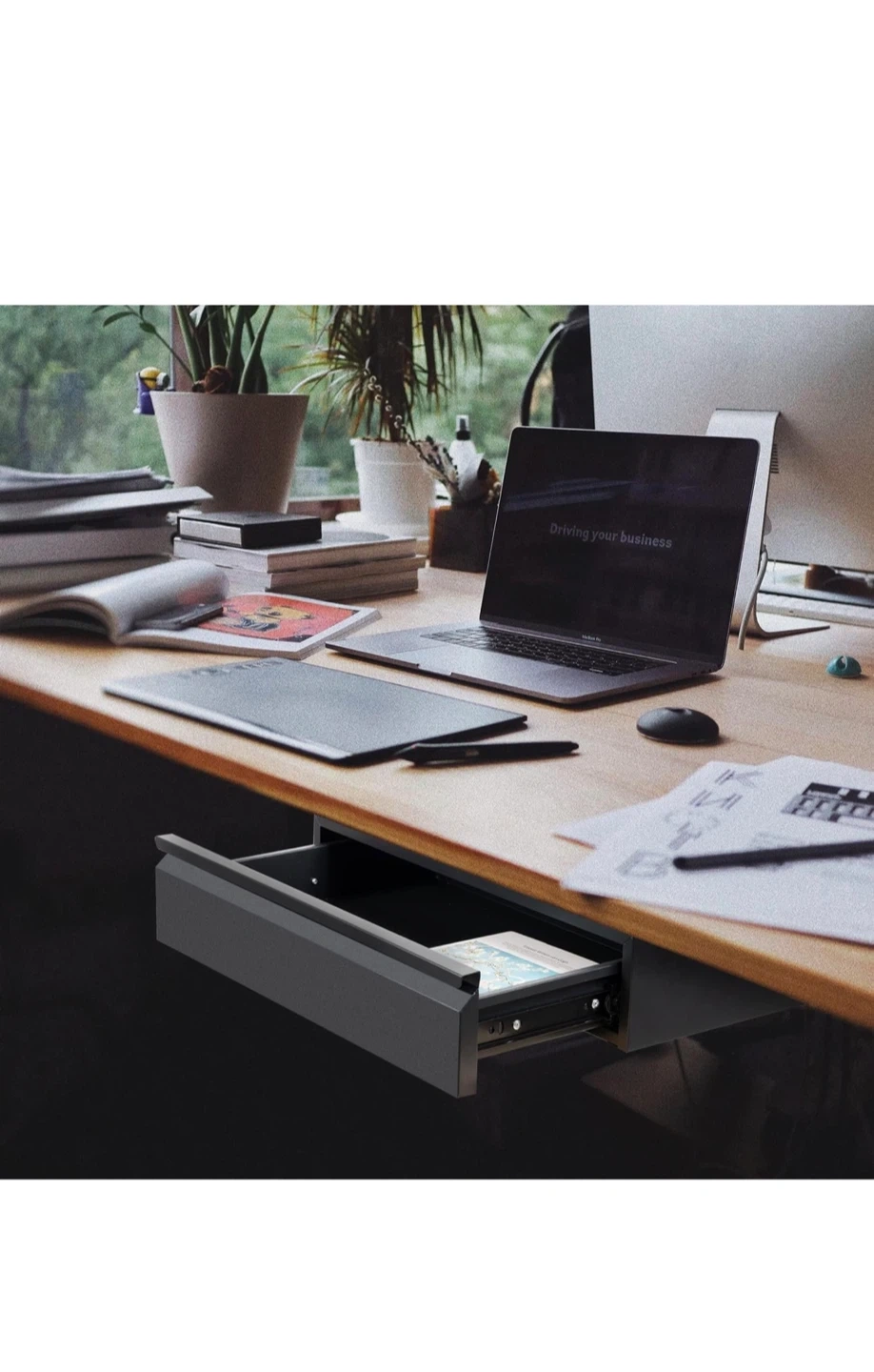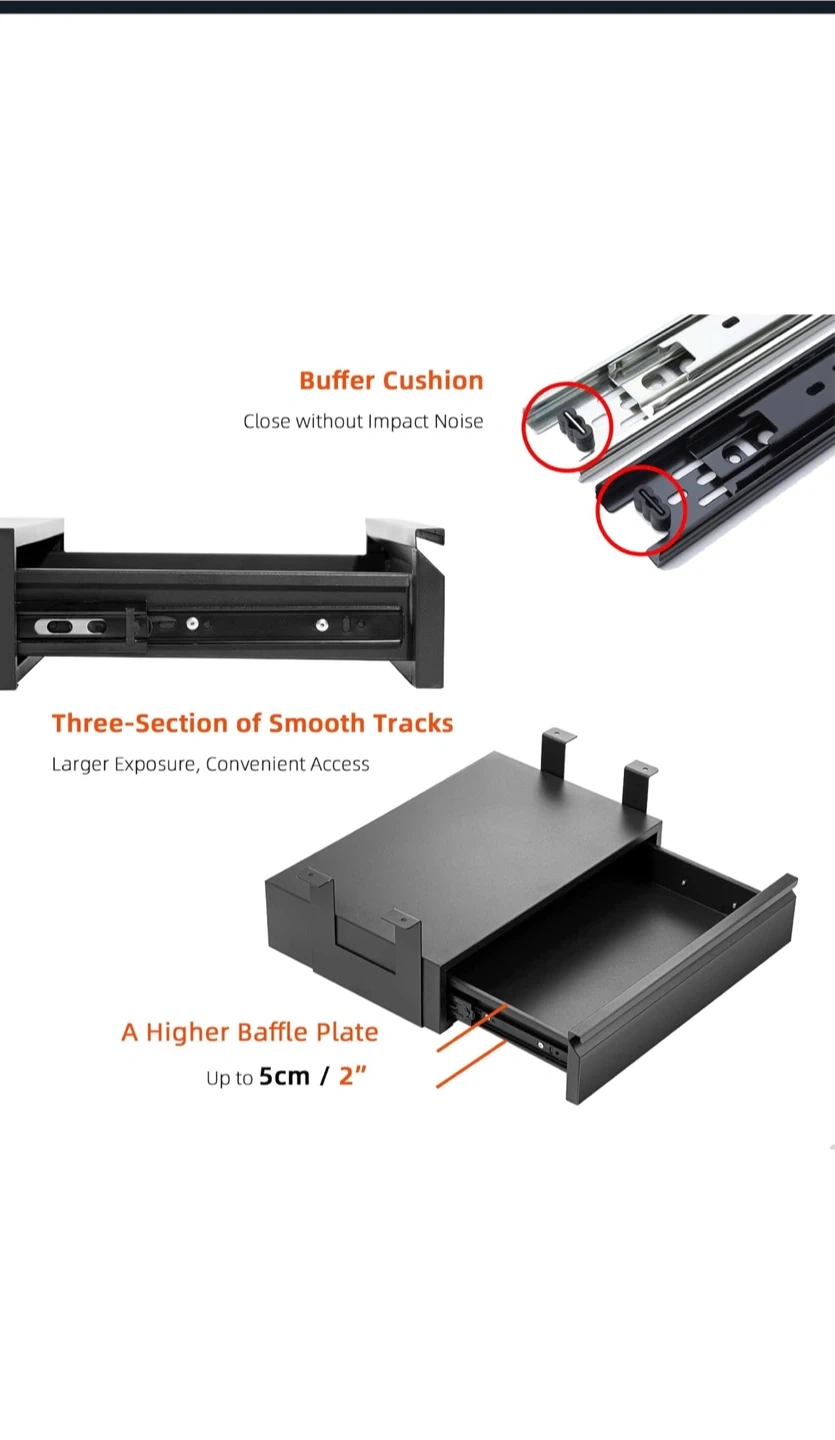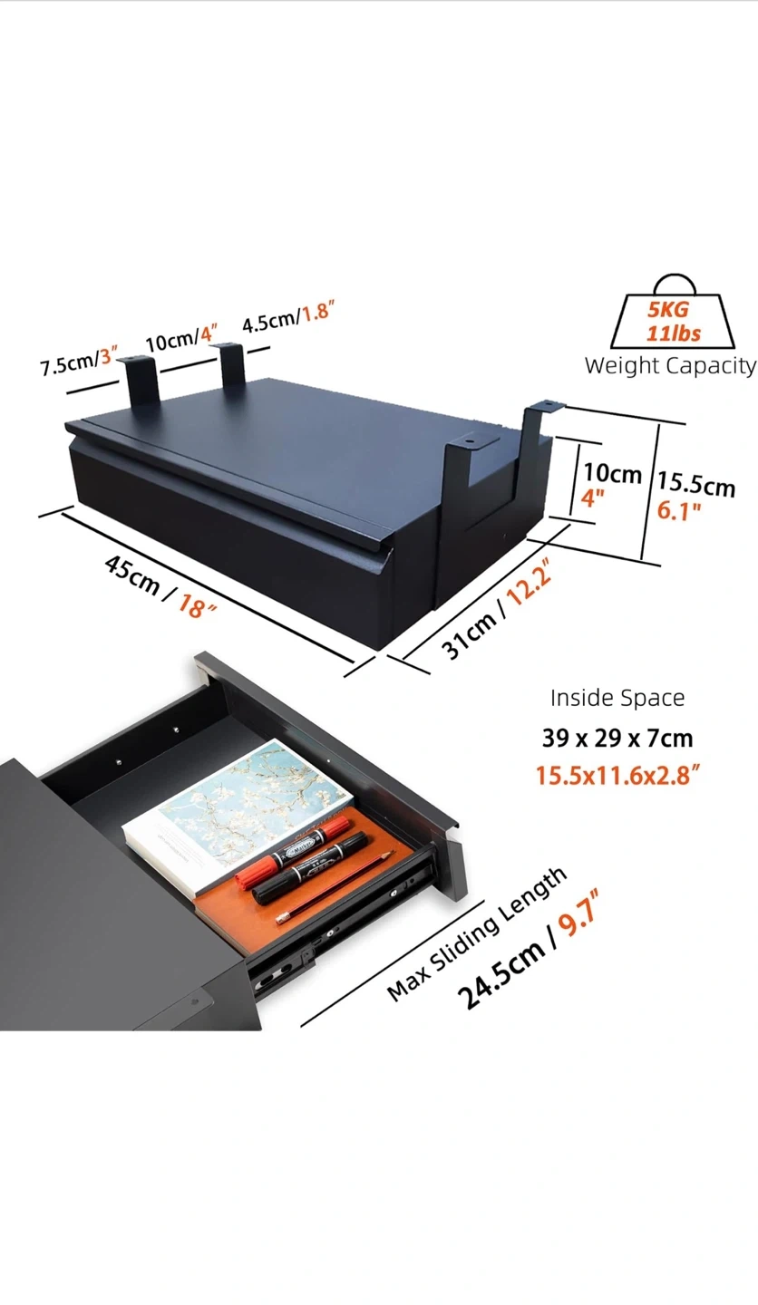 This under desk drawer is 45cm wide and made of black metal. It features three-section smooth tracks for convenient access. The buffer cushion ensures quiet operation.
