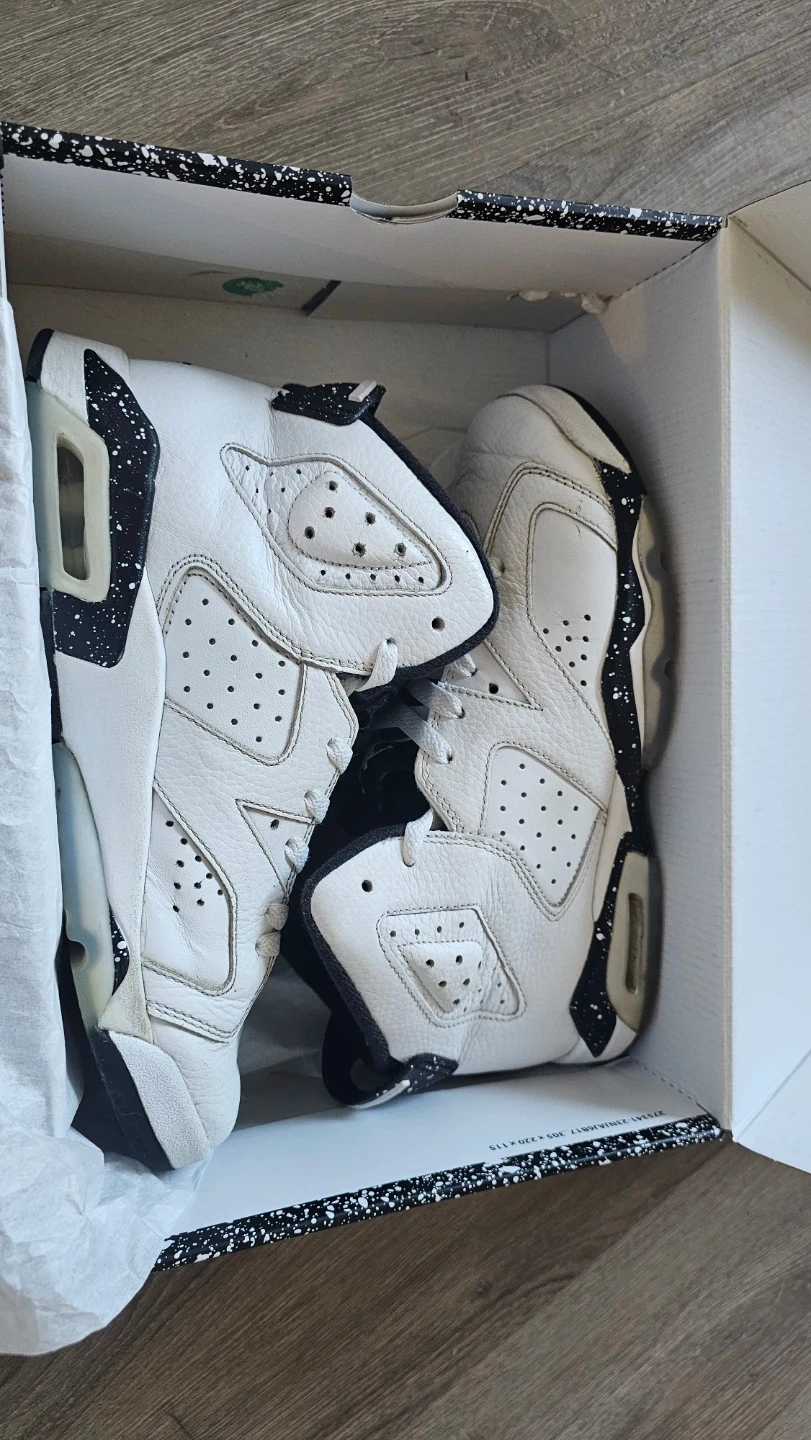 These are Air Jordan 6 Retro sneakers in GS size 6.5. They're white with black speckle accents and detailing. Includes the original box.