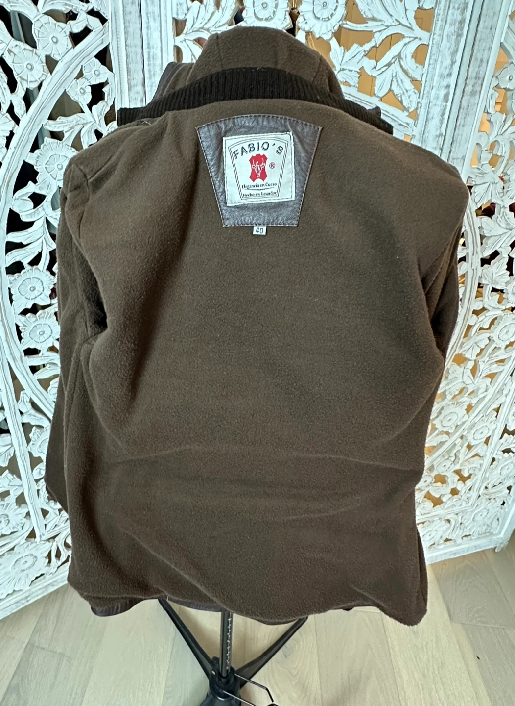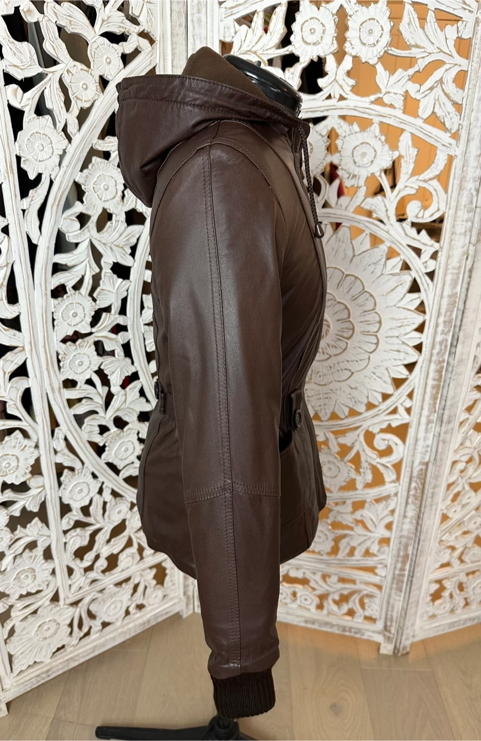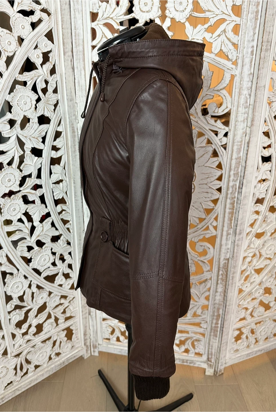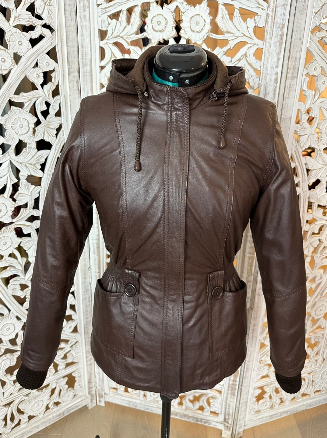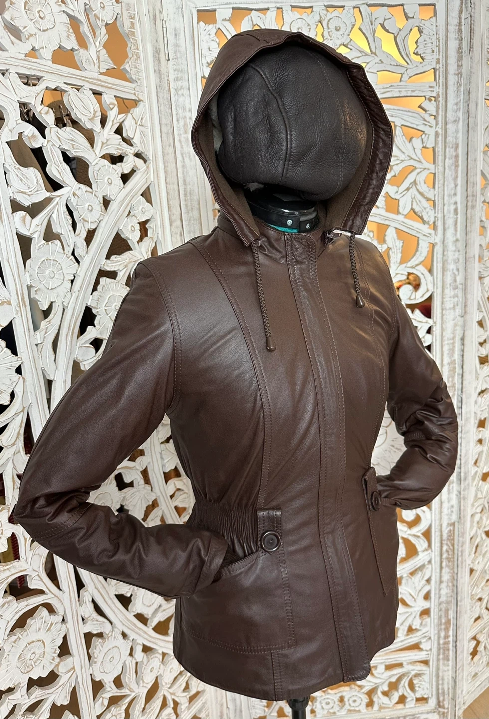 This Fabio jacket is a versatile, must-have piece for any fashion-forward wardrobe. Crafted from 100% genuine brown leather with knit collar and sleeve details, it features a pleated waist, a zipper closure, and a removable hood for added versatility. The fleece lining ensures warmth and comfort, making it perfect for cold fall, spring, and mild winter days.