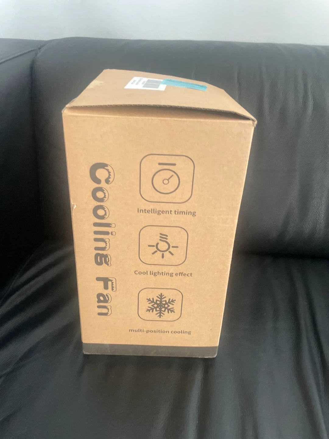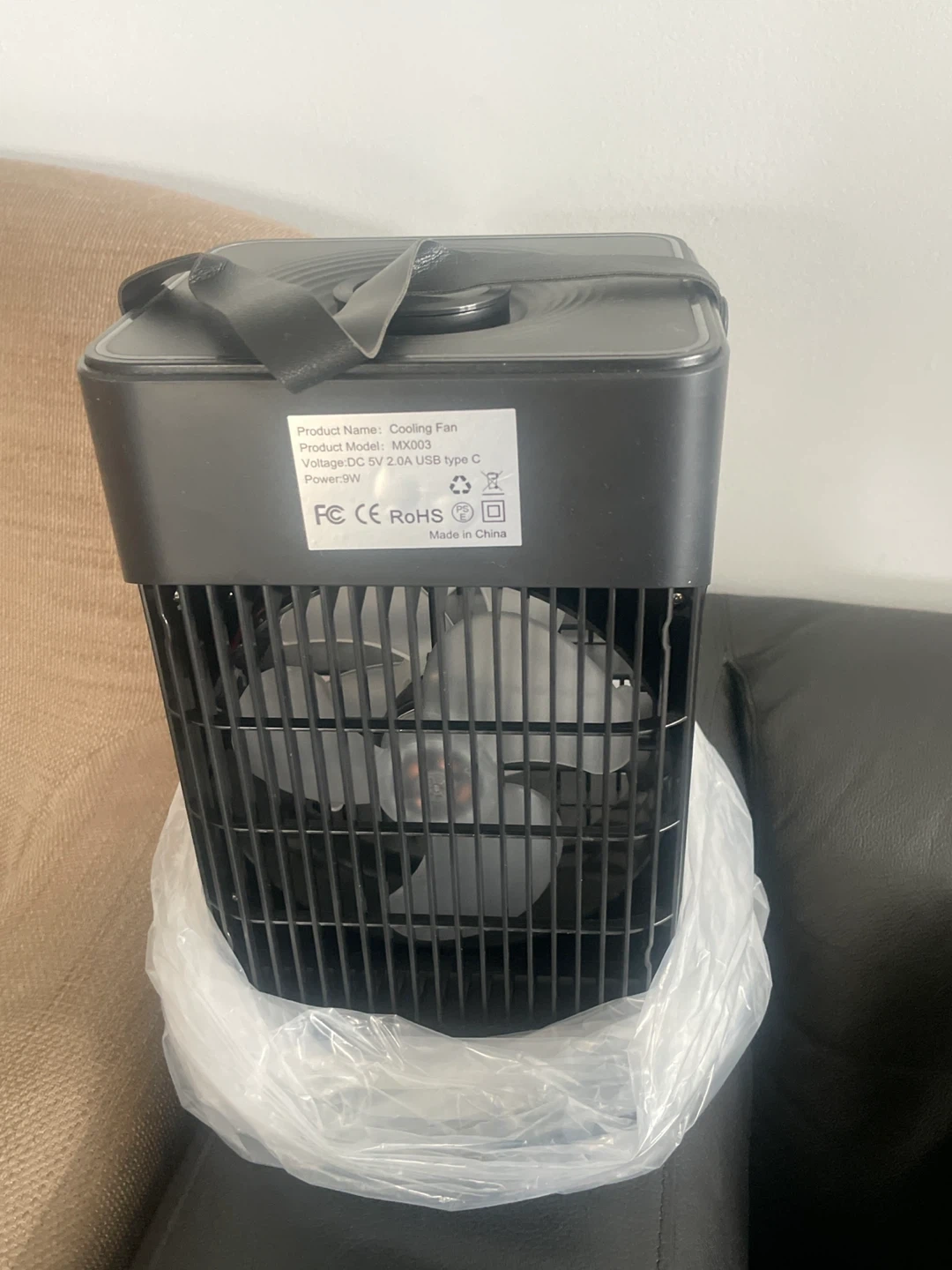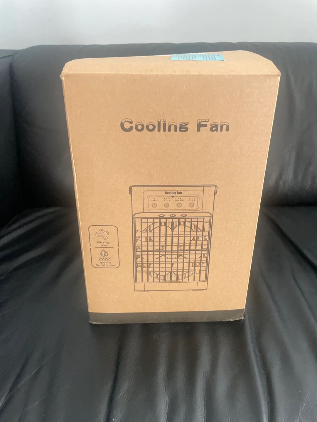 Used only once - This portable air cooler has a 1100 ml tank capacity and a powerful 9W motor. It offers intelligent timing, cool lighting effects, and multi-position cooling. It's made of ABS material and measures 181*150*270mm. It comes with a USB charging cable and a remote control.
