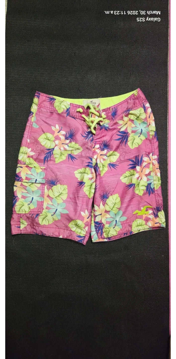 Hollister swim trunks with a pink floral print. Features a drawstring waist and cargo pocket. These shorts are great for beach or pool days!