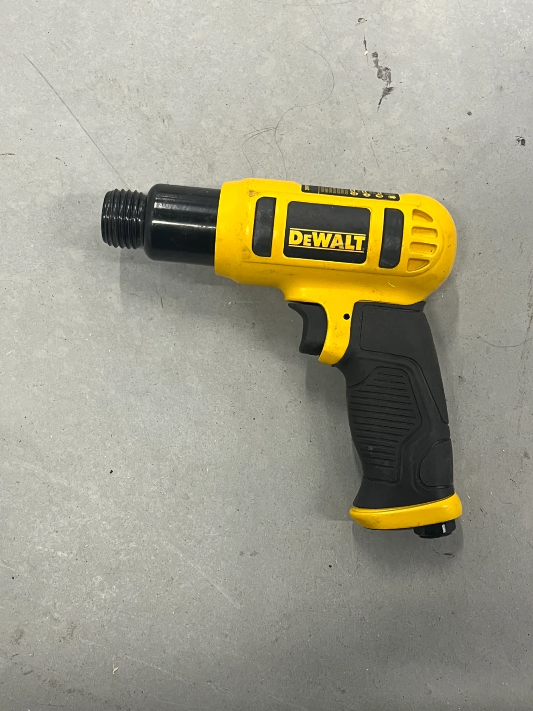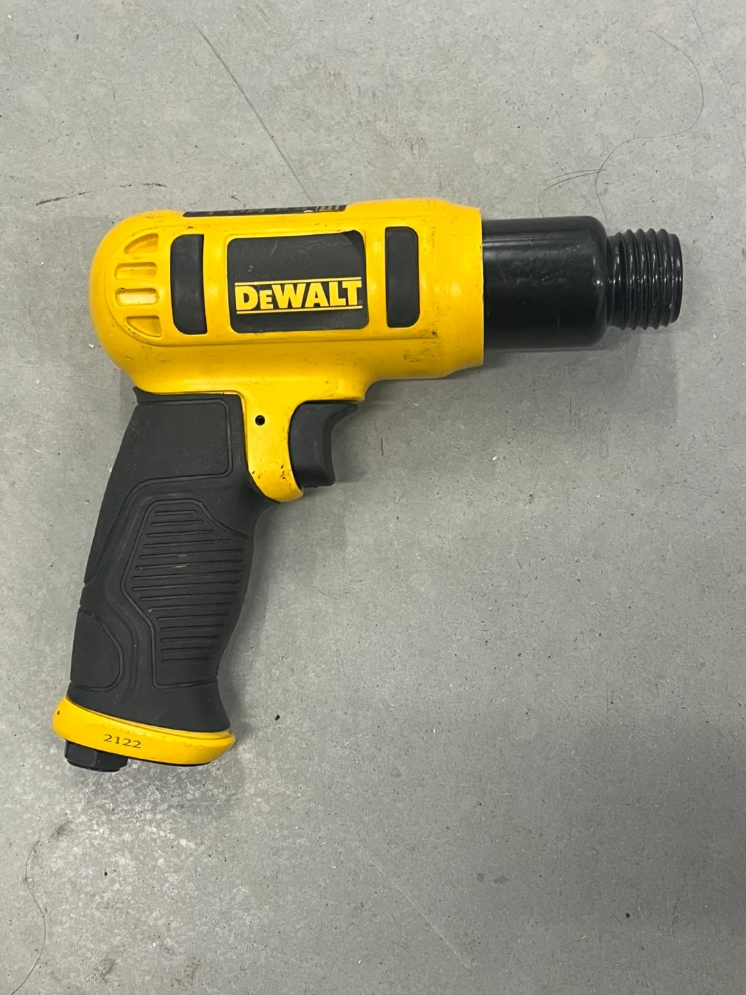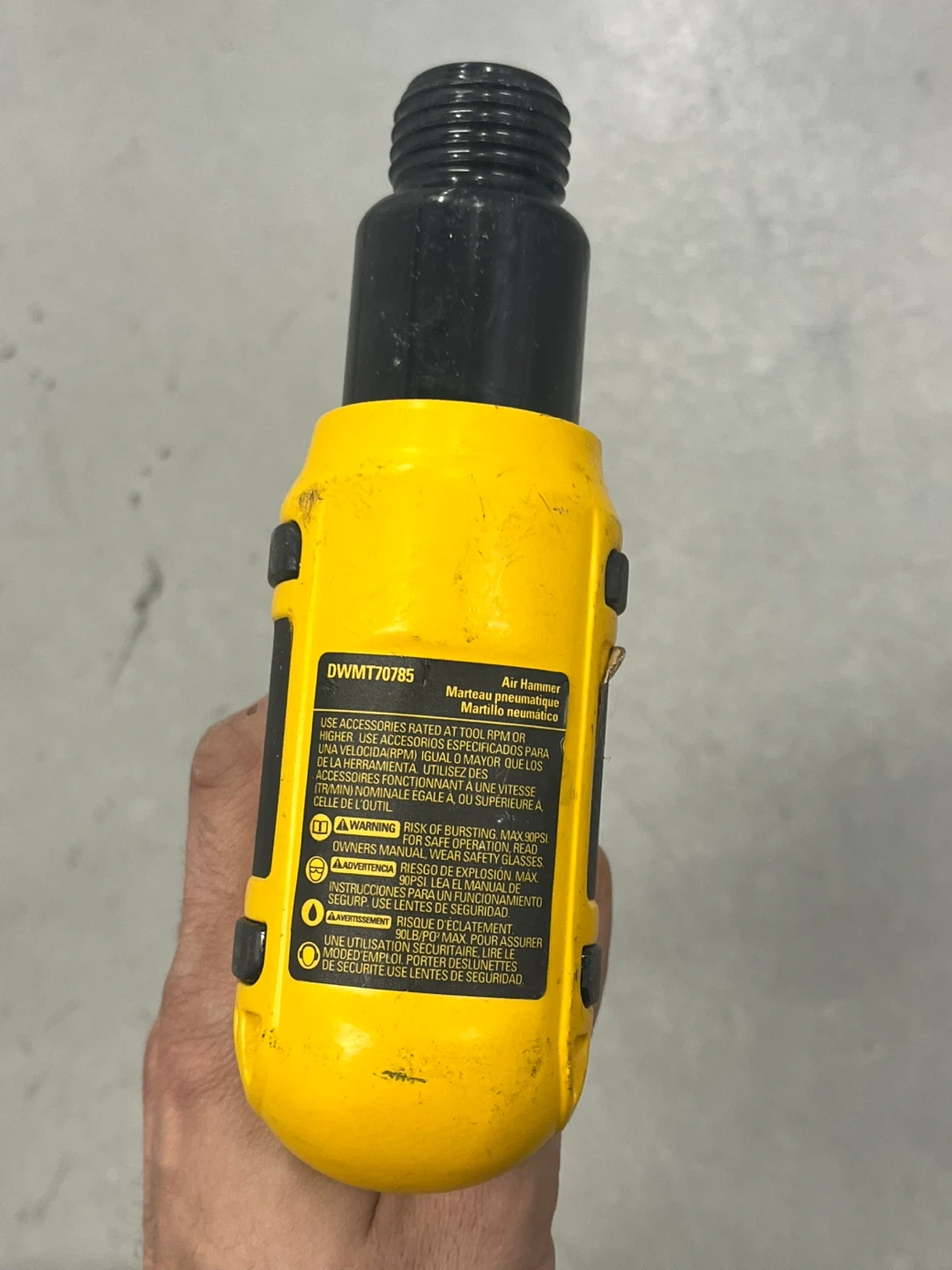 This is a DEWALT air hammer, model DWM T70785. It's yellow and black with a rubberized grip. The air hammer operates at a maximum of 90 PSI.