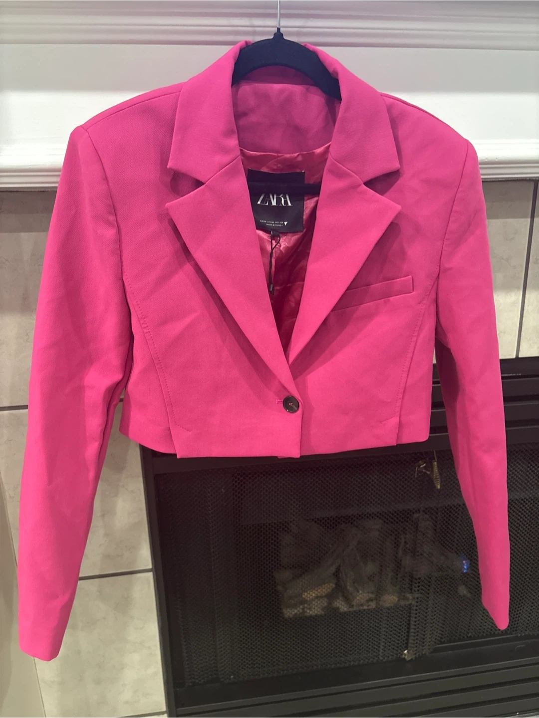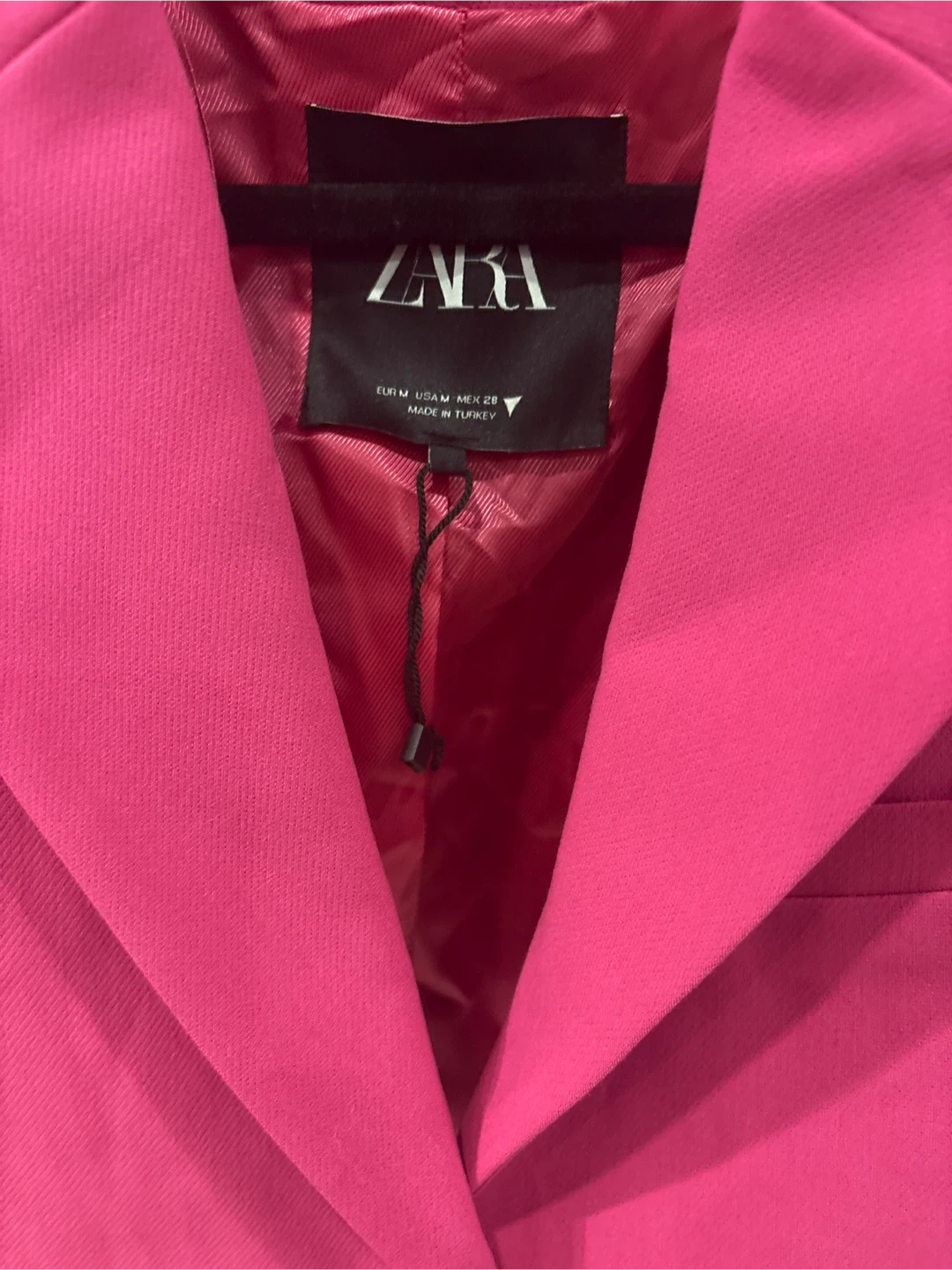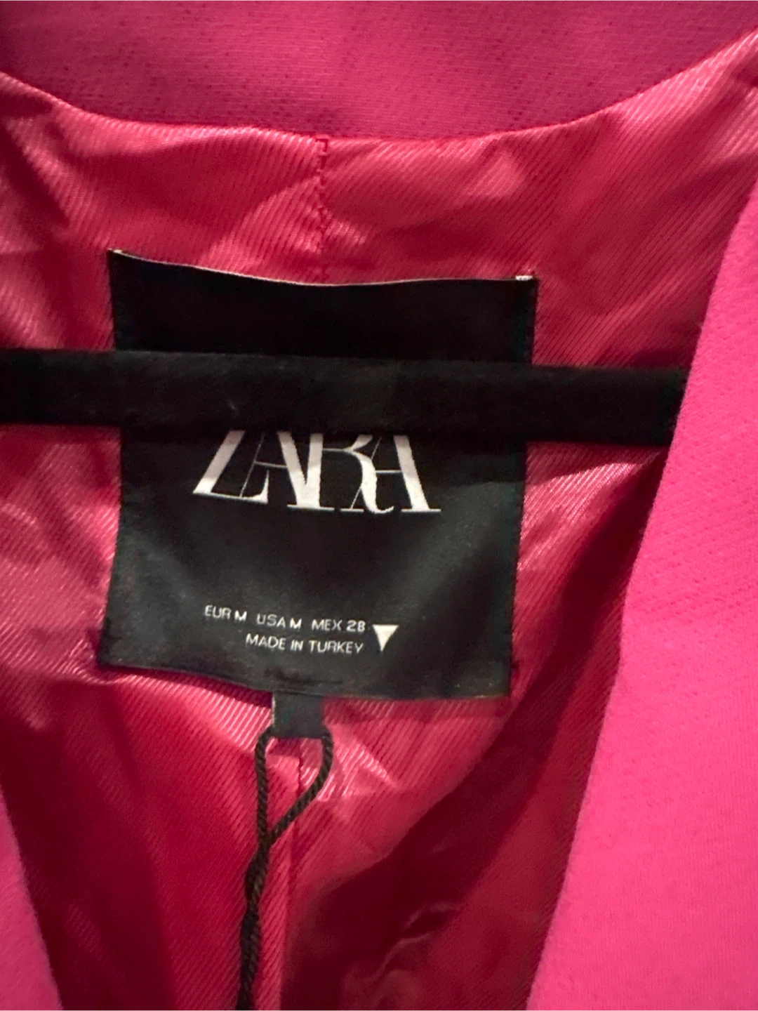 A stylish Zara cropped blazer in a vibrant pink colour. It's a size medium, with EUR M, USA M, MEX 28 sizing indicated on the tag. Made in Turkey. This blazer is perfect for adding a pop of colour to any outfit, whether dressing up or down! New Wiht out tag size Medium