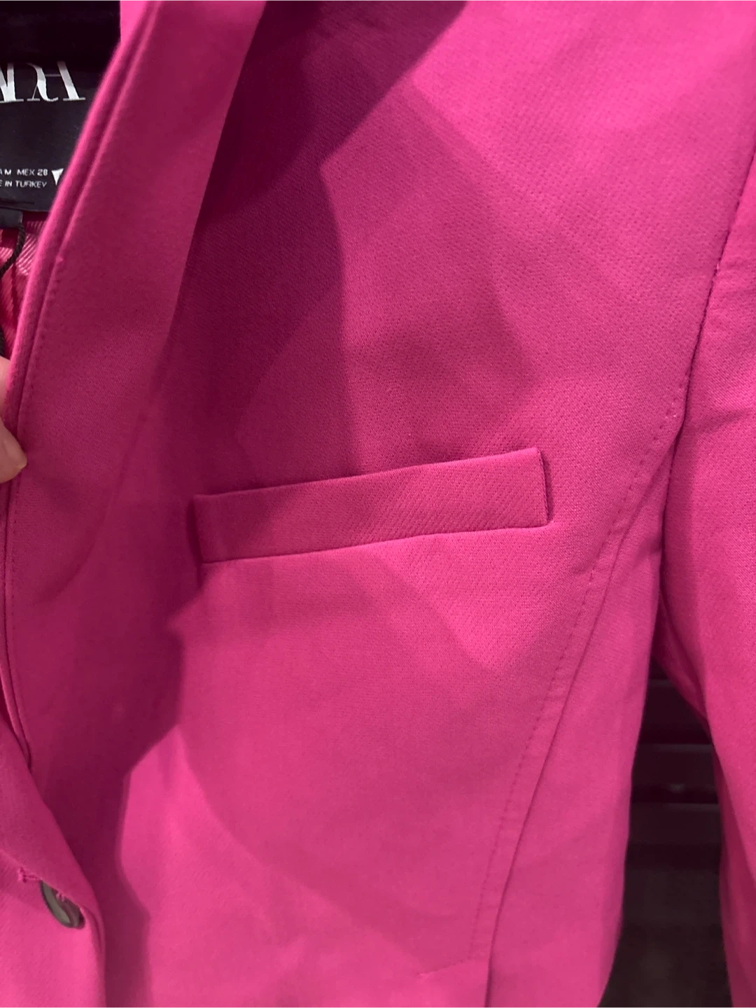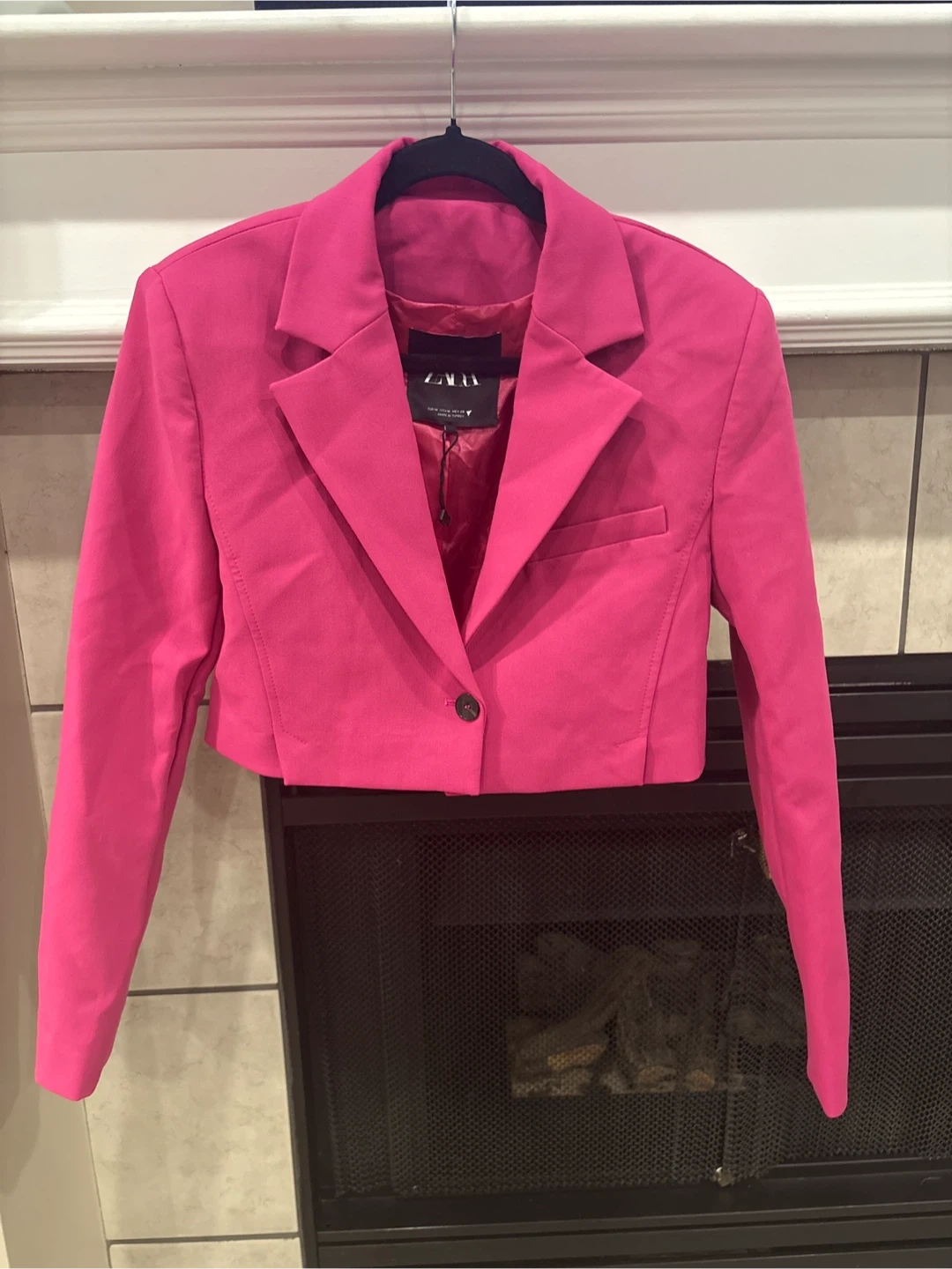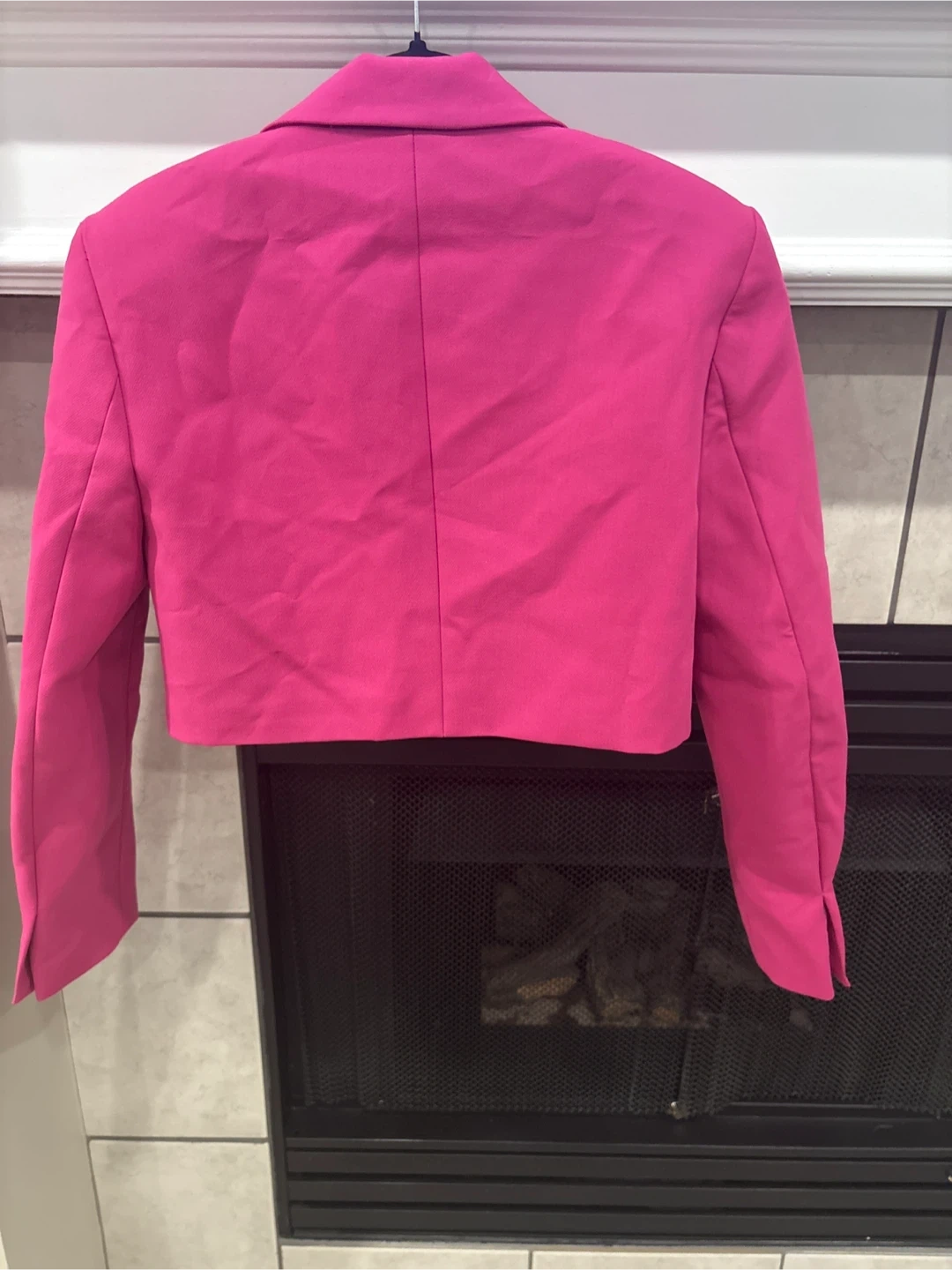 A stylish Zara cropped blazer in a vibrant pink colour. It's a size medium, with EUR M, USA M, MEX 28 sizing indicated on the tag. Made in Turkey. This blazer is perfect for adding a pop of colour to any outfit, whether dressing up or down! New Wiht out tag size Medium