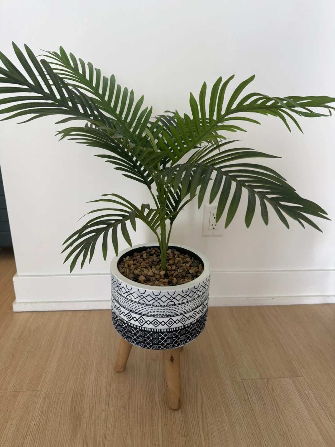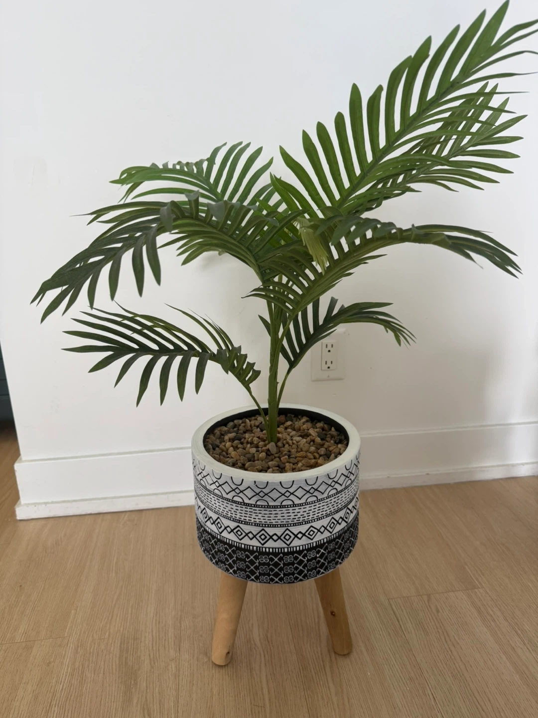 Hi! I'm selling this beautiful artificial majesty palm tree. It comes with a stylish black-and-white patterned pot and a natural wooden tripod stand. It’s a perfect decor piece to brighten up any corner of your home without any maintenance!