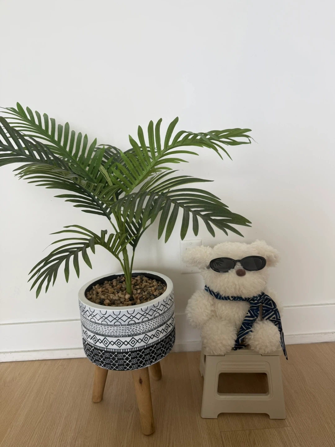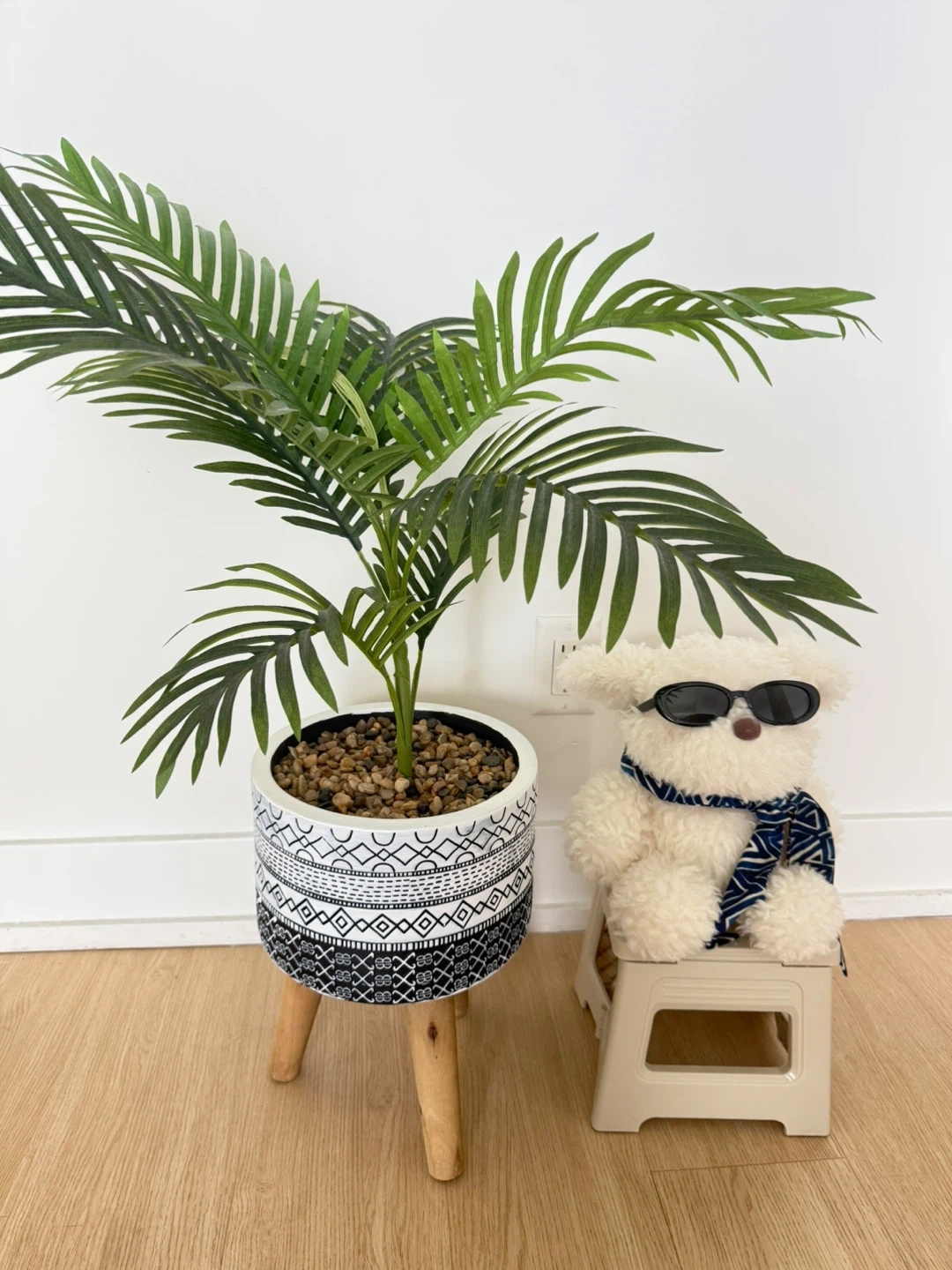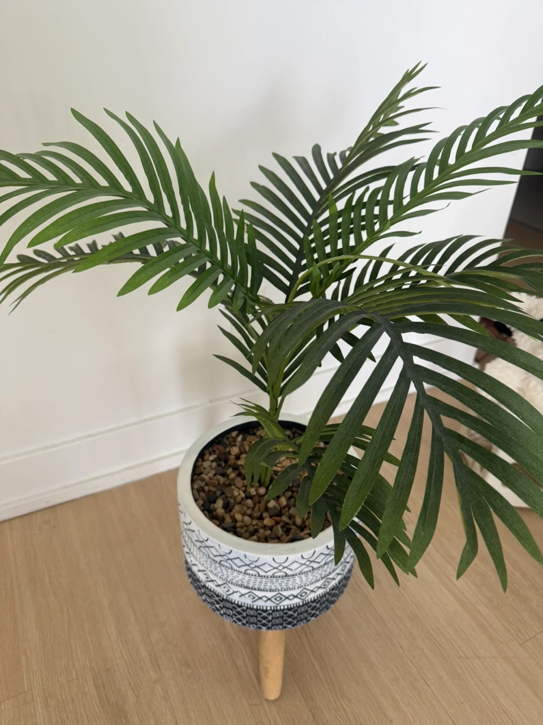 Hi! I'm selling this beautiful artificial majesty palm tree. It comes with a stylish black-and-white patterned pot and a natural wooden tripod stand. It’s a perfect decor piece to brighten up any corner of your home without any maintenance!