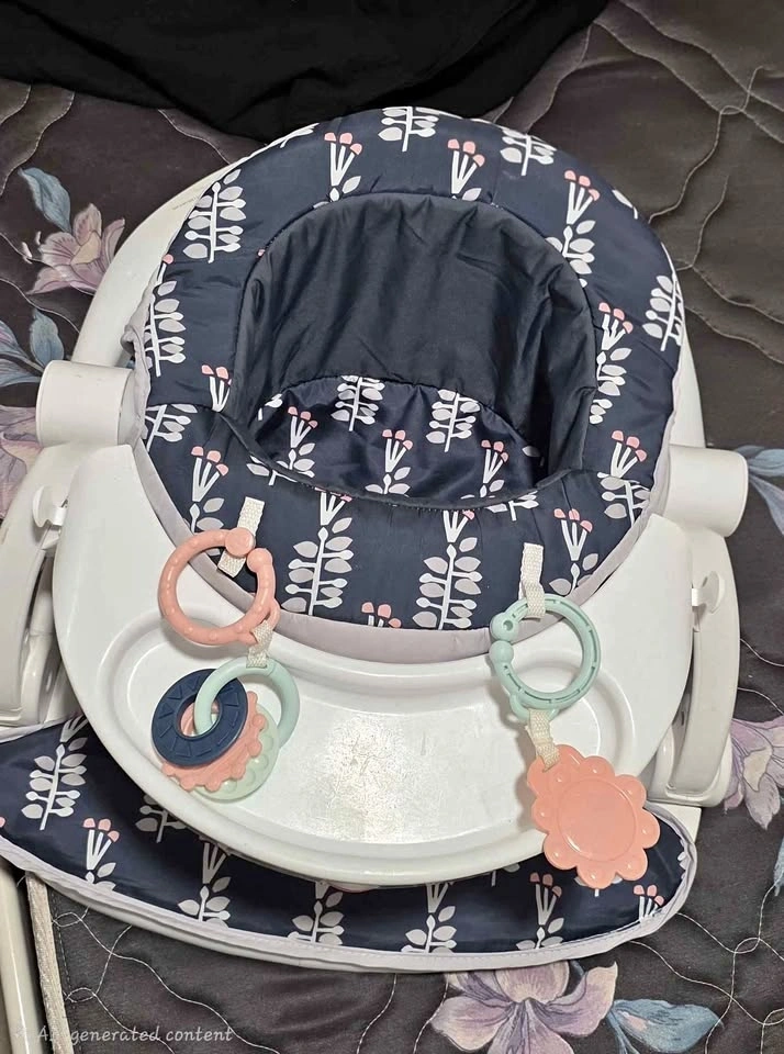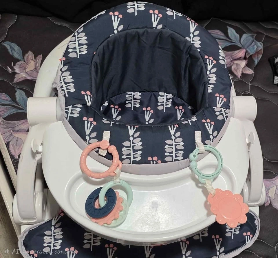 Cute baby booster seat! Has a comfy navy blue fabric insert with a white and pink leaf pattern. Comes with a white tray and some fun attached toys. Great for little ones learning to sit up or for meal times.