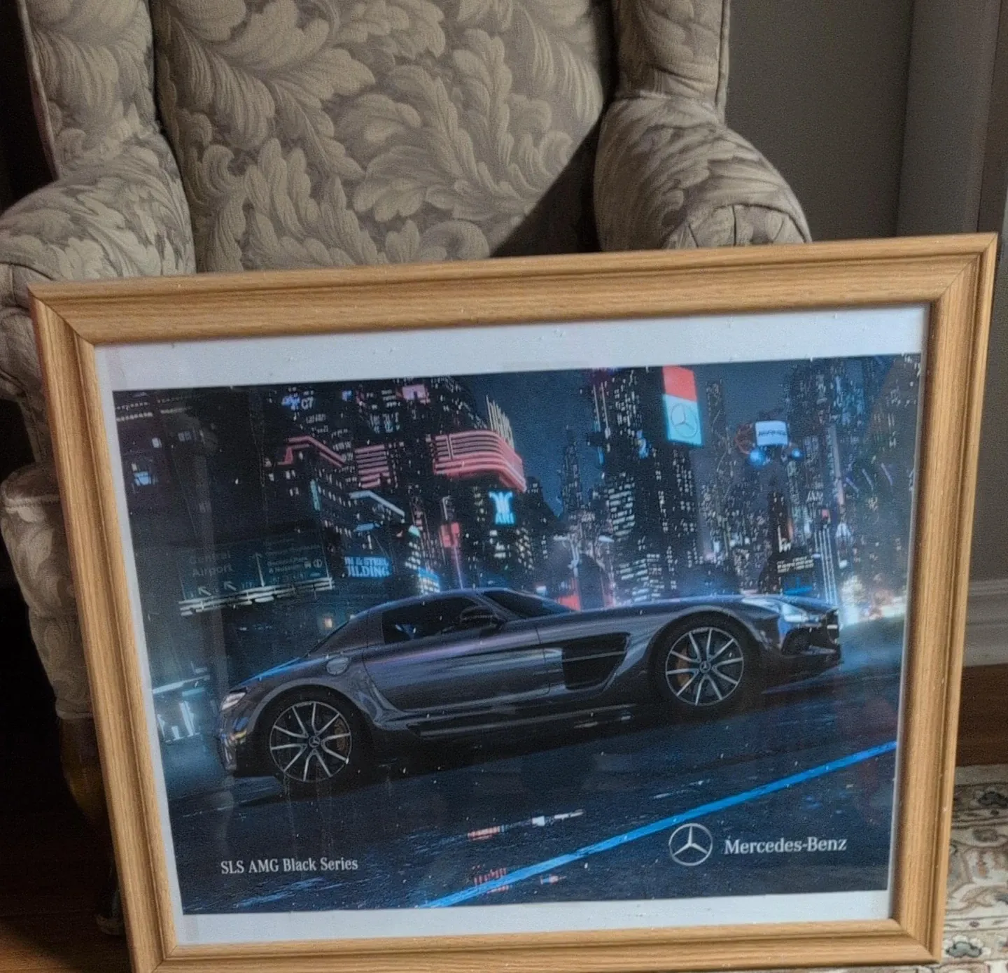 Framed print of the Mercedes-Benz SLS AMG Black Series. Features a detailed image of the car with a city skyline in the background. Includes the Mercedes-Benz logo. This print would look great in a garage or fan's den!