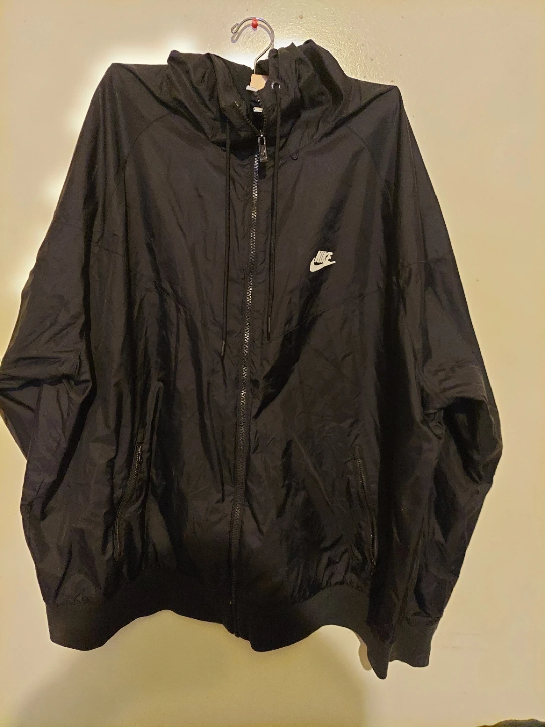 This is a Nike black windbreaker jacket. It features a full zip closure and a hood. It's made of lightweight material and includes two zippered side pockets.