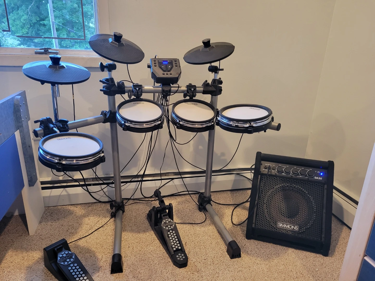 Selling a Simmons electronic drum kit. It includes the drum module, pads, kick pedal, hi-hat pedal, and a Simmons DA50 amplifier. All components are visible in the photos.
